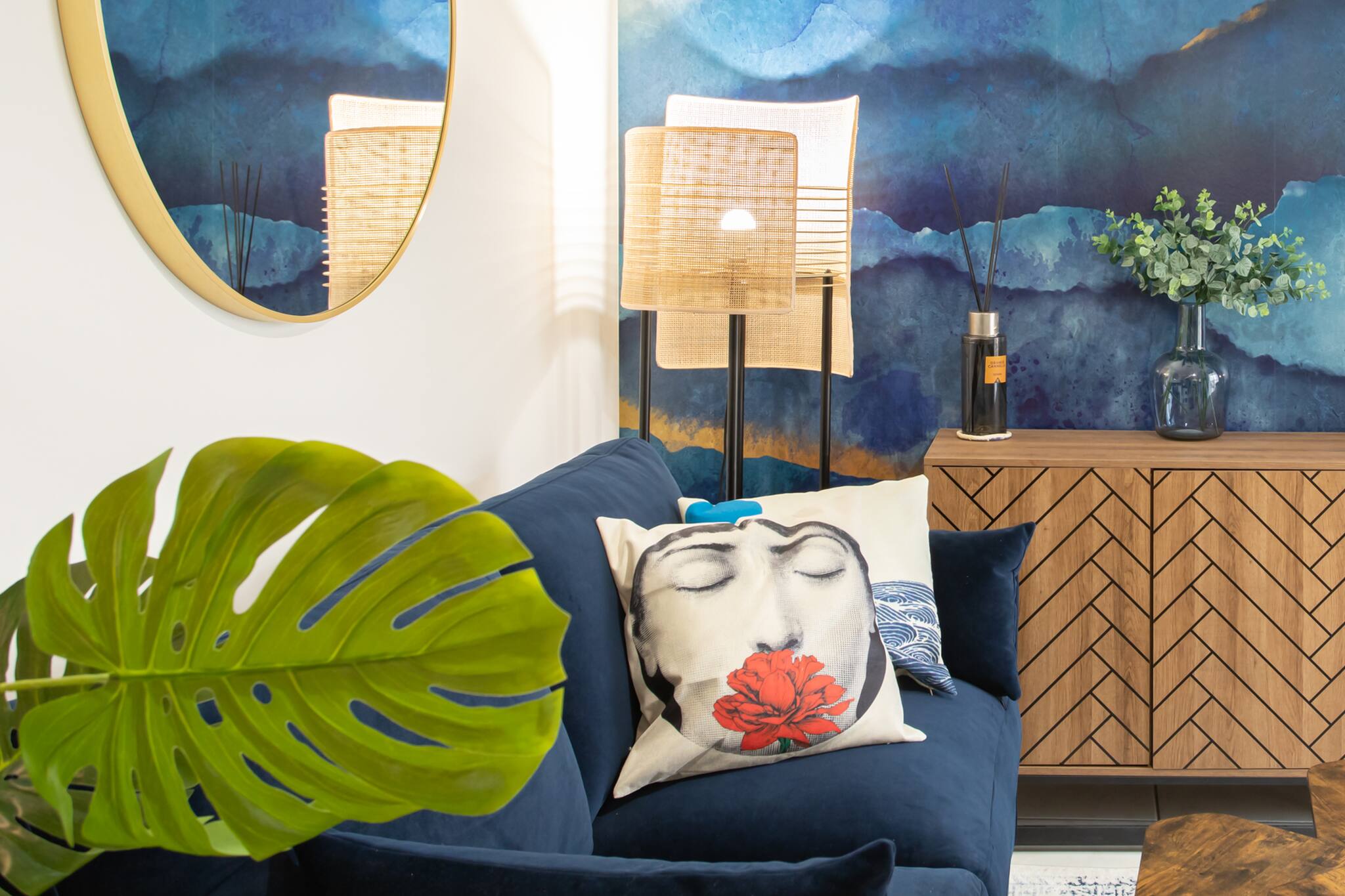 . Salon équipé avec canapé, table basse, TV, climatisation réversible