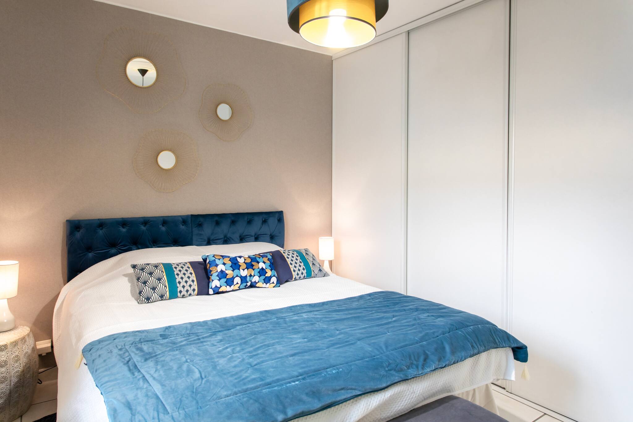 . Une chambre principale avec Lit double 160cm, climatisation, accès au balcon filant, double vitrage, placards de rangements, lampes de chevets, meuble coiffeuse