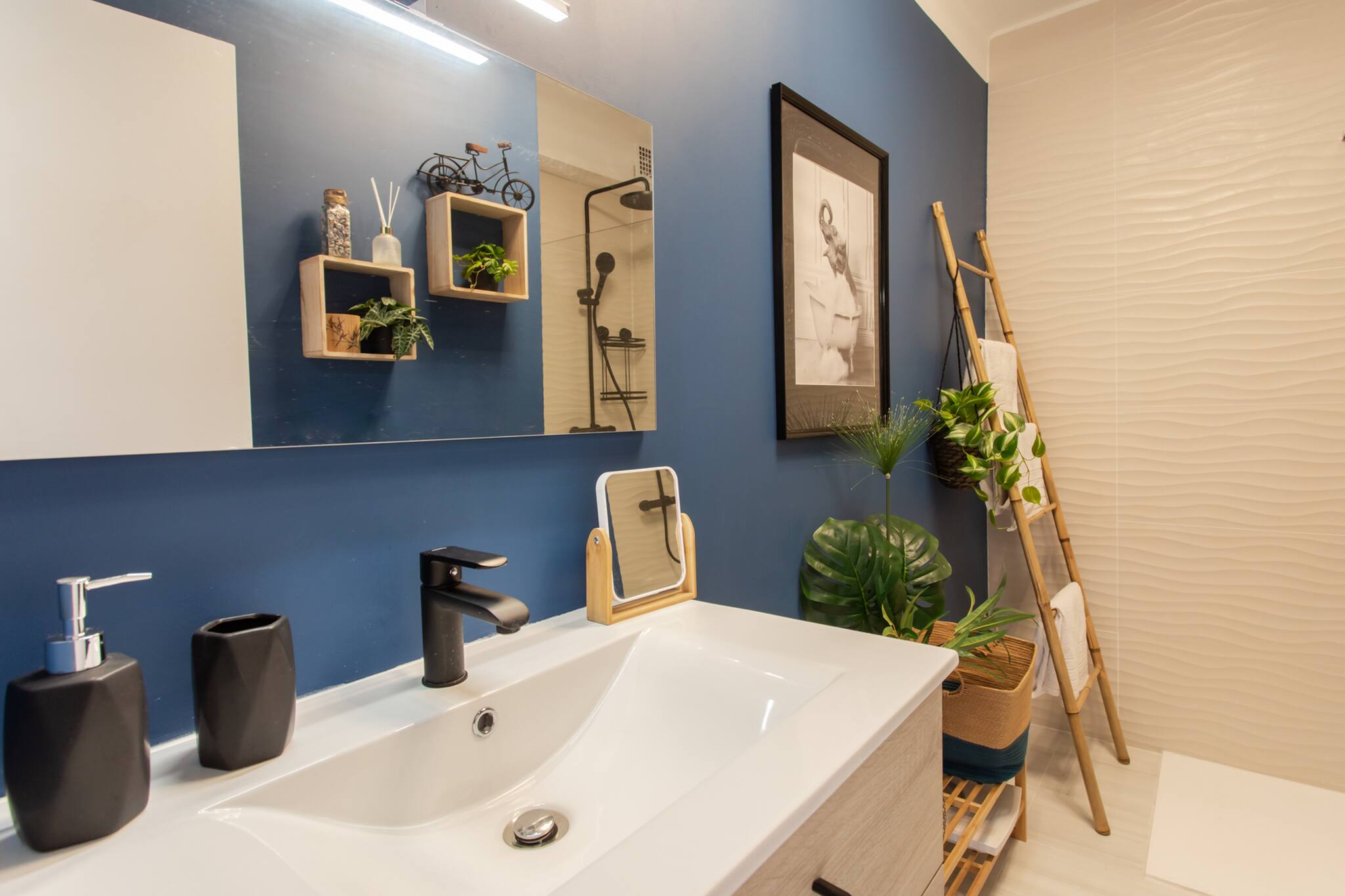 . Salle de bain avec vasque, baignoire, bidet, WC, sèche-cheveux, sèche serviette