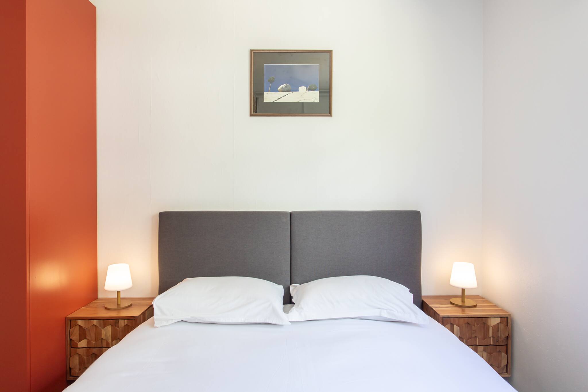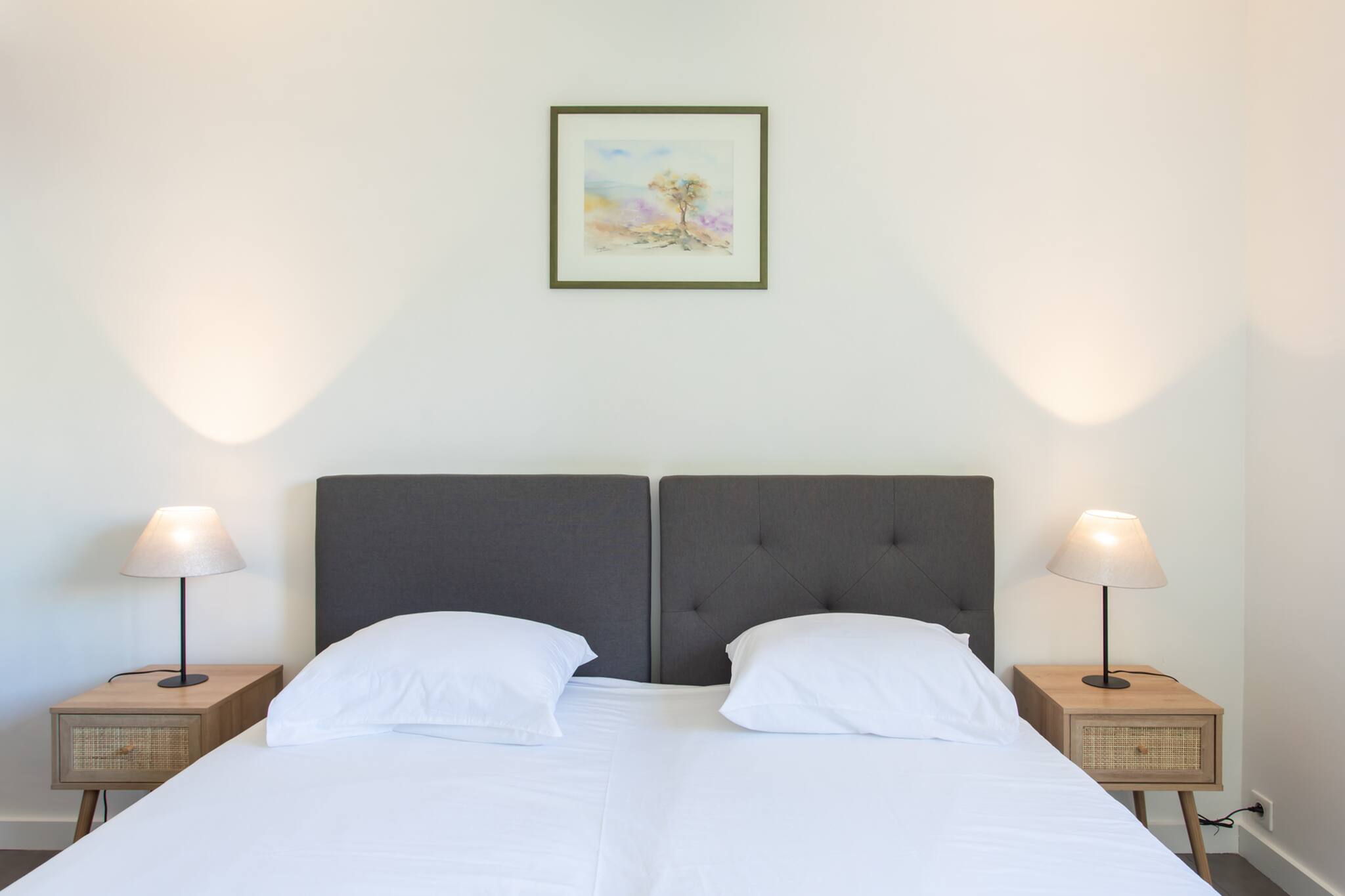 . Une chambre avec deux lits jumeaux 90cm, lampes de chevets, accès balcon secondaire
