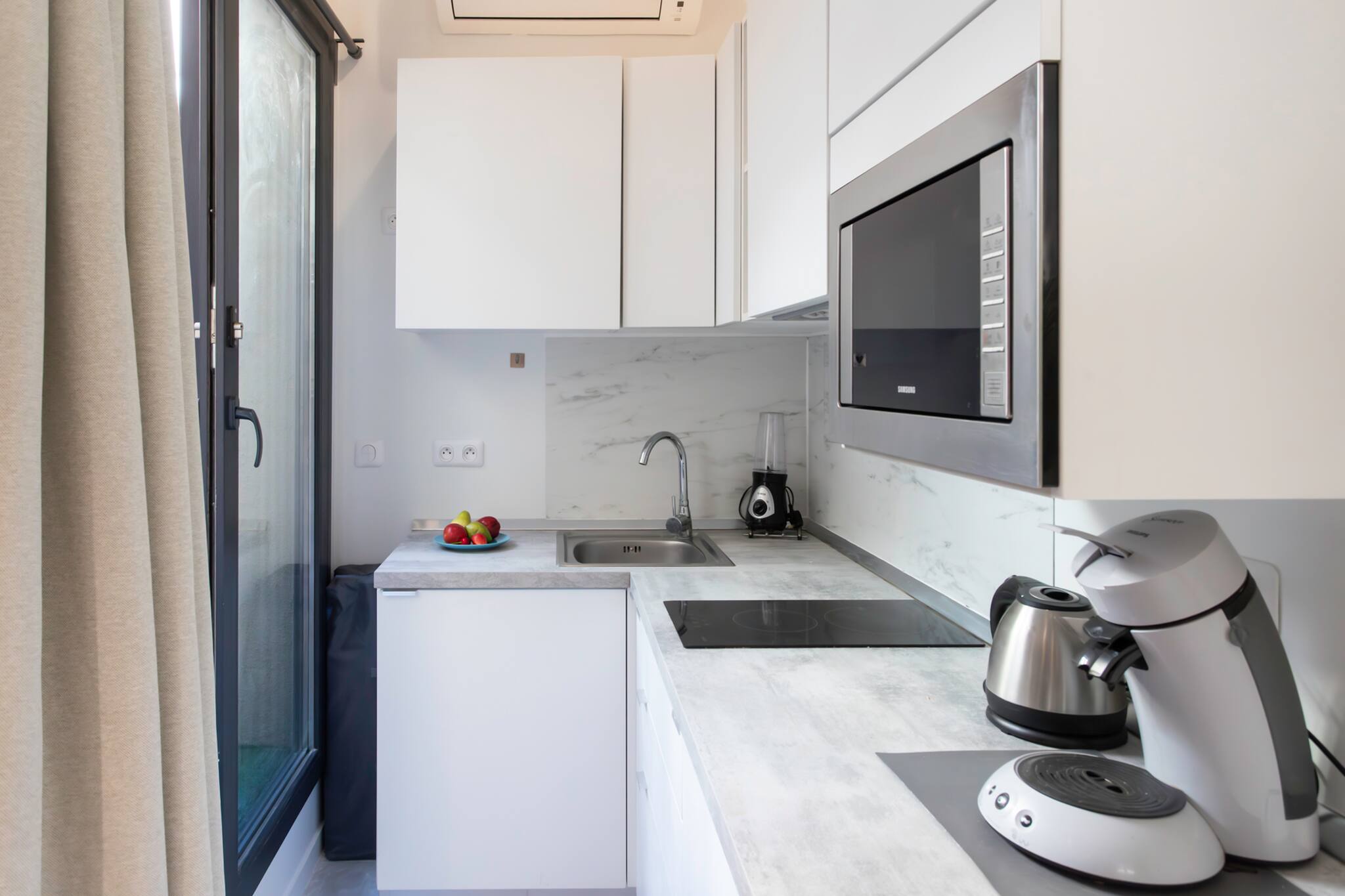 . Une cuisine équipée : réfrigérateur, compartiment congélateur, micro-onde, plaque de cuissons électriques, machine à café, bouilloire, grille-pain et un kit avec le nécessaire pour cuisiner