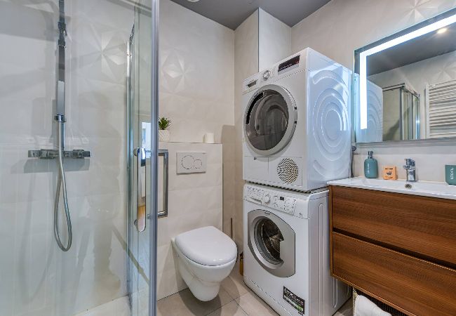 • Une salle de bain avec douche, évier, sèche-cheveux, miroir, WC, sèche linge et lave linge