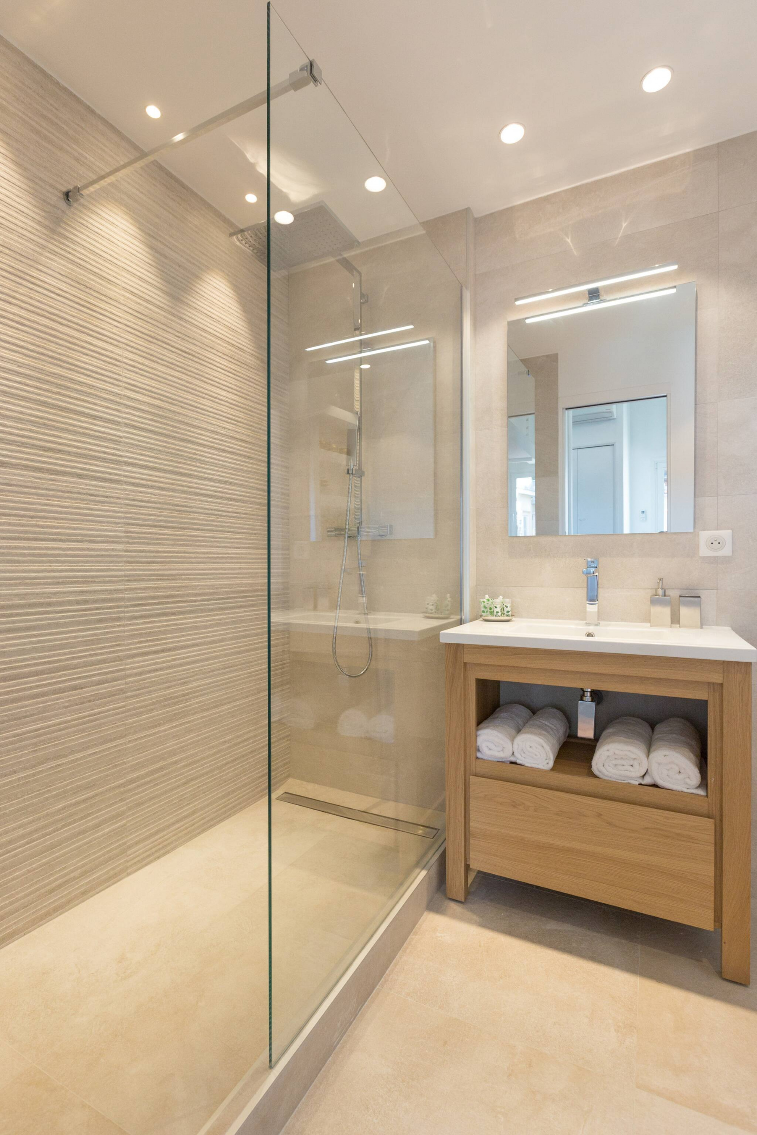 La salle de bain spacieuse saura vous séduire avec ses éclairages d’ambiance et constituera un lieu idéal pour prendre soin de votre intimité. Présentant des finitions soignées, elle offre une grande douche à l’italienne et une grande vasque.
