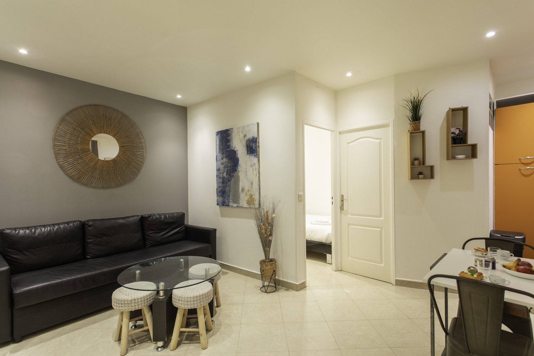 Salon : canapé, table basse, télévision, coin repas avec table pour 2 personnes et espace dressing.