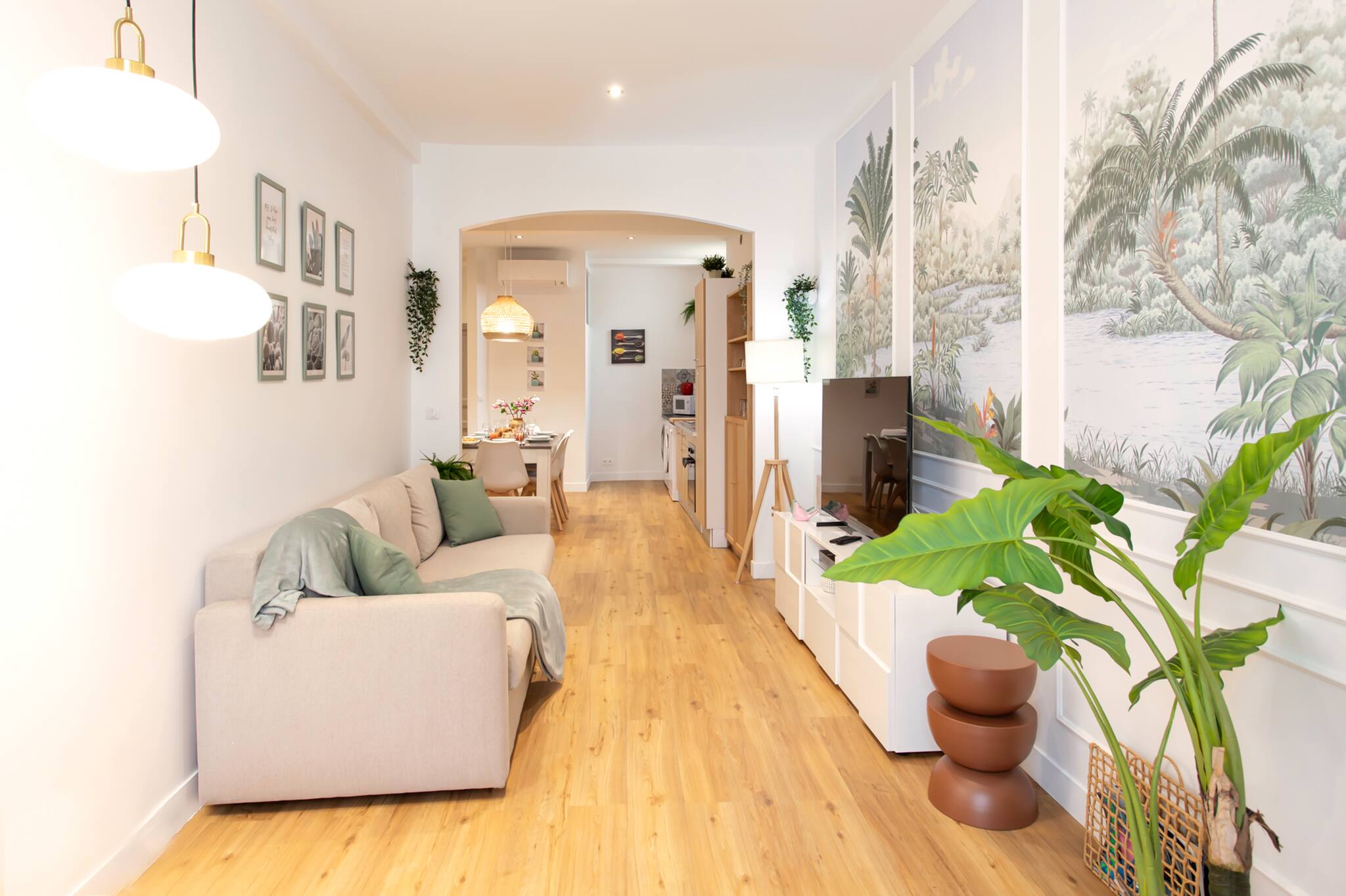 . Un espace salon décoré avec soin équipé de la clim réversible, de 2 canapés canapé, d’une table basse, d’une TV et sa console