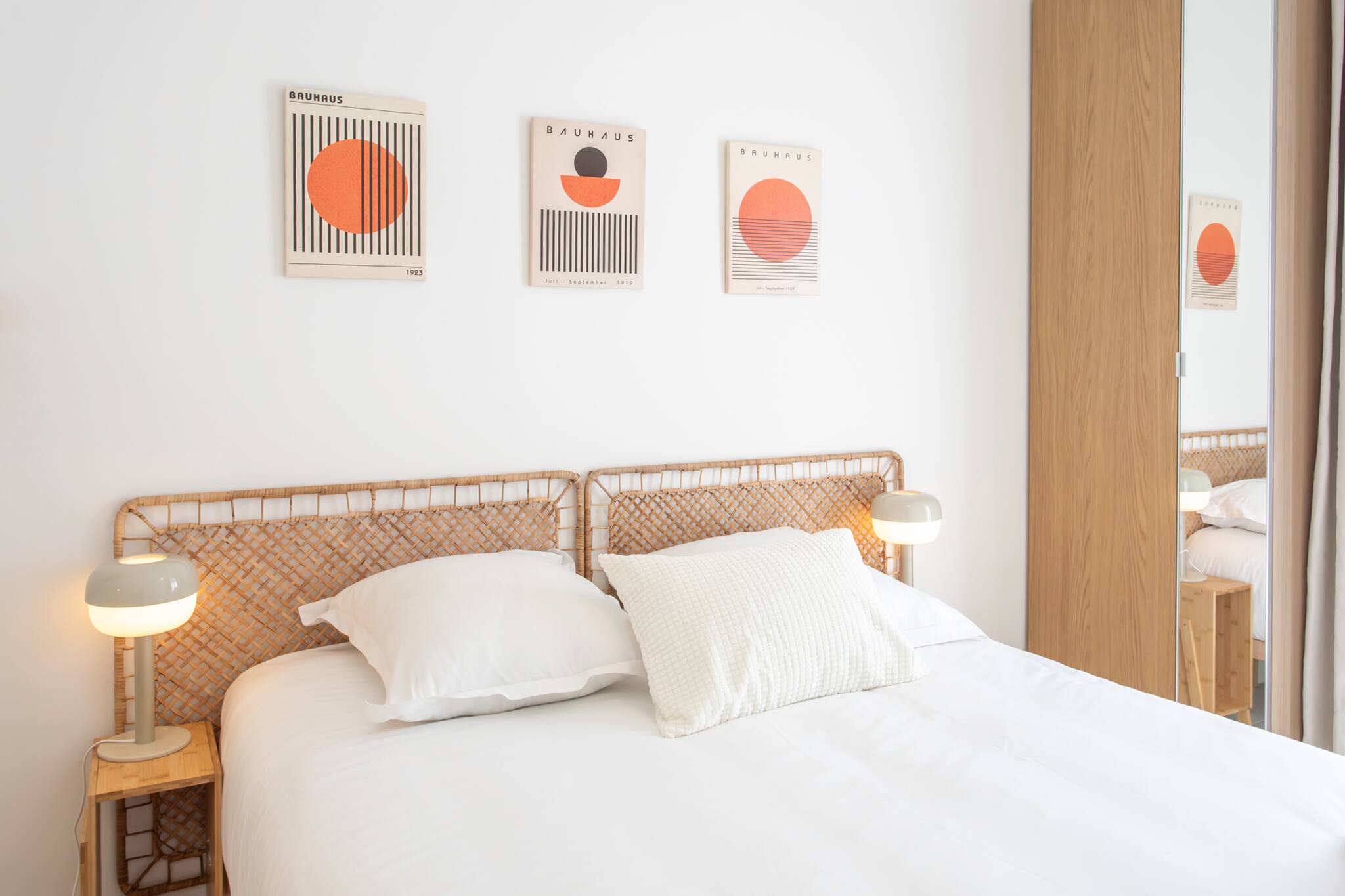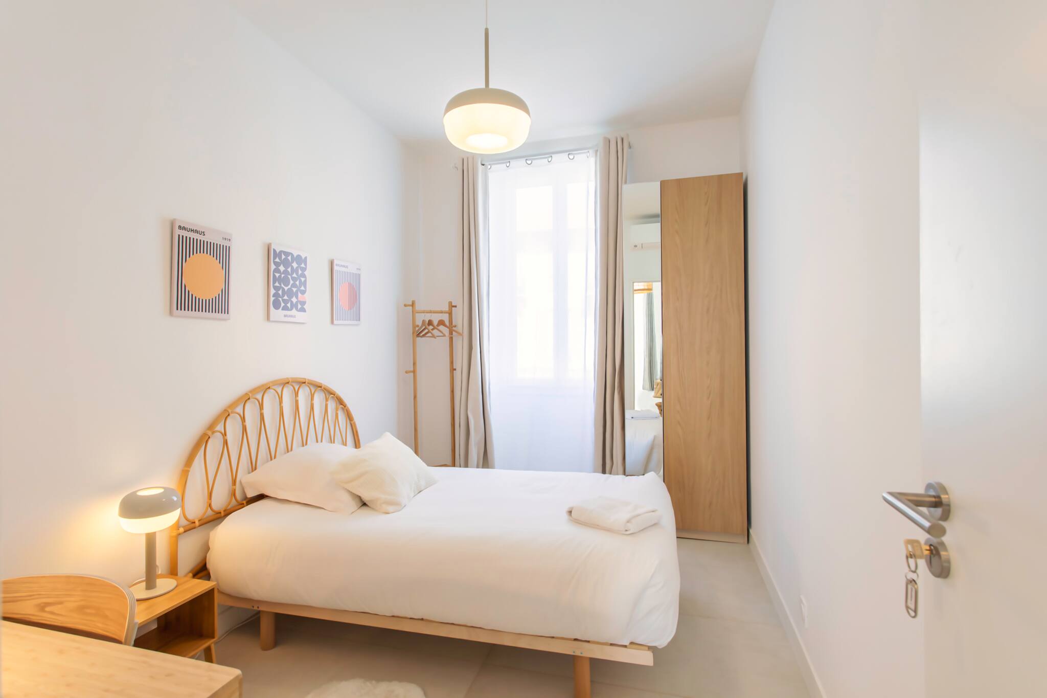 . Une première chambre avec lit double 160x200cm, avec tables de nuits, placard et climatisation réversible, fenêtre sur rue avec double vitrage