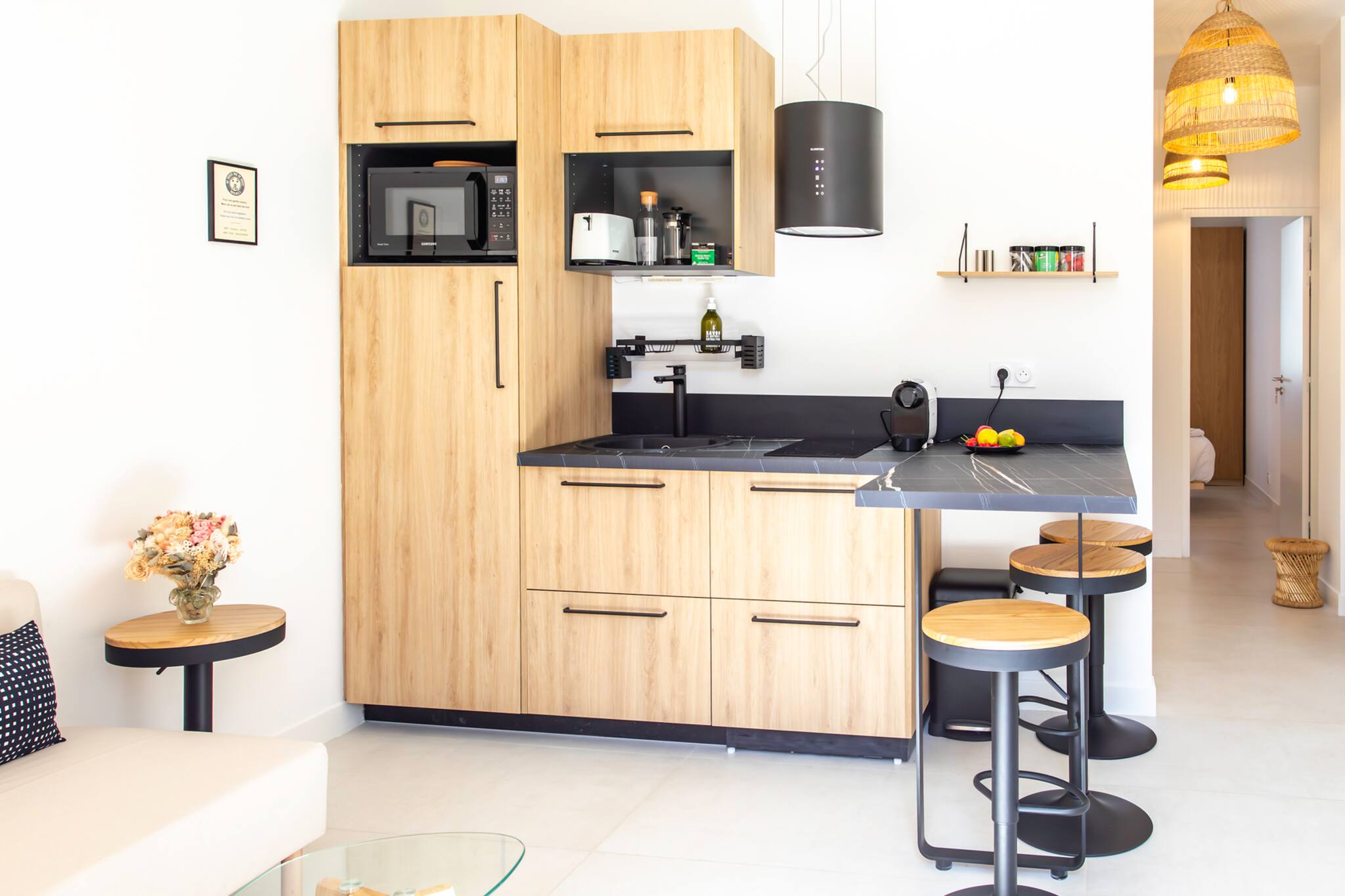 . Une cuisine équipée ouverte sur le salon, équipée avec meuble de rangements, évier, plan de travail, plaques de cuissons inductions, machine à café Nespresso, bouilloire électrique, grille-pain, avec hotte aspirante, four micro-onde, lave-vaisselle, un kit de plats vaisselle et ustensiles de cuisine