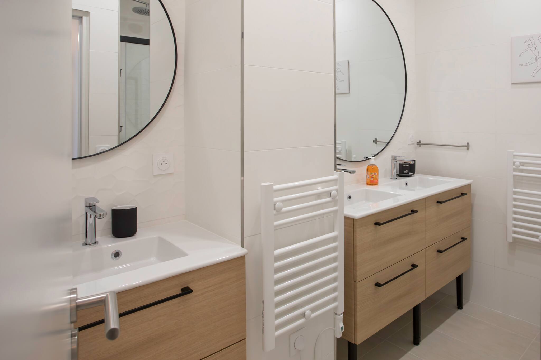 - La salle de bain est équipée d’une douche, d’un lavabo, d’un sèche-cheveux, d’un sèche-serviettes et de WC.