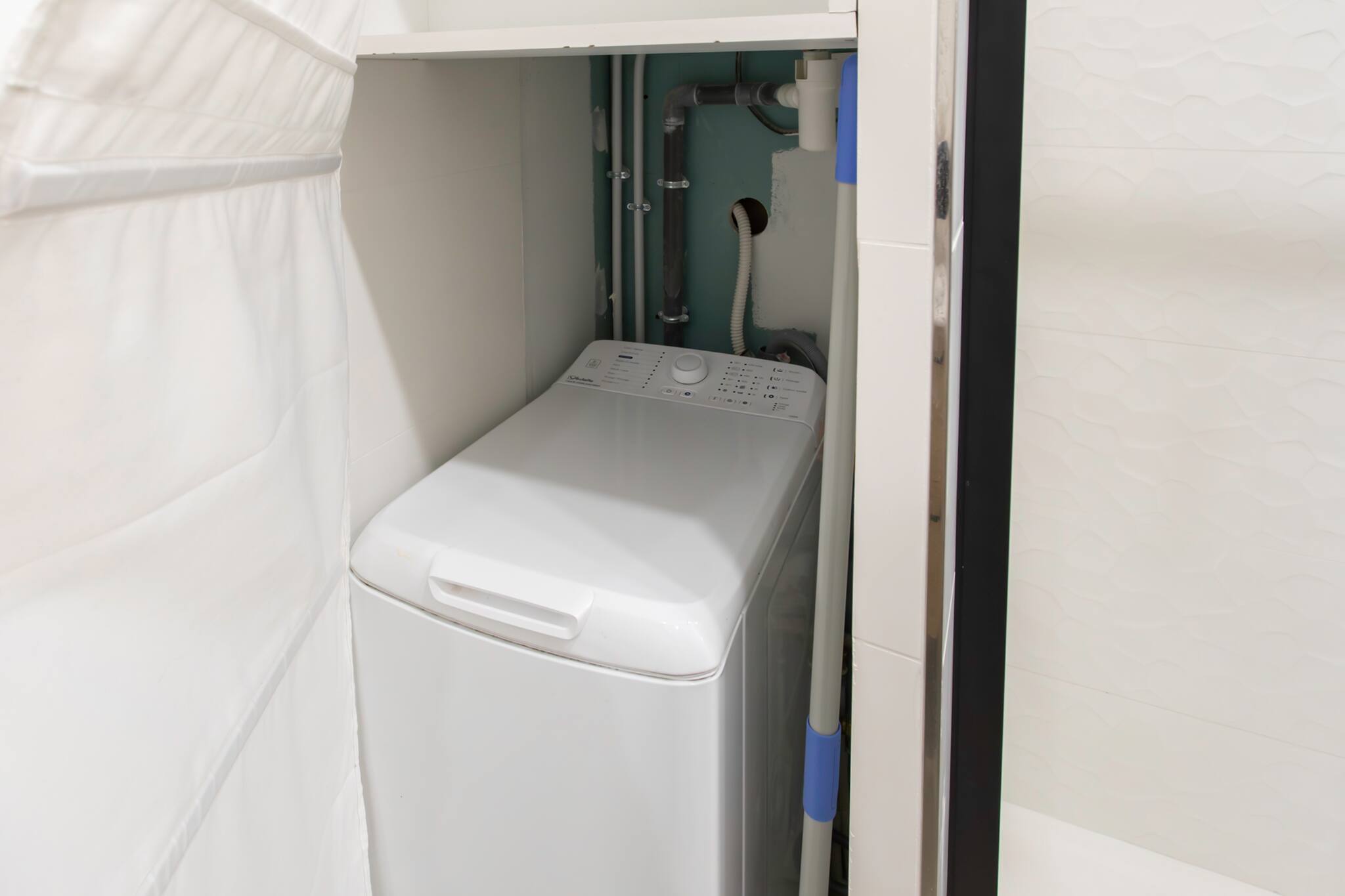 Machine à laver dans placard de salle-de-bains.