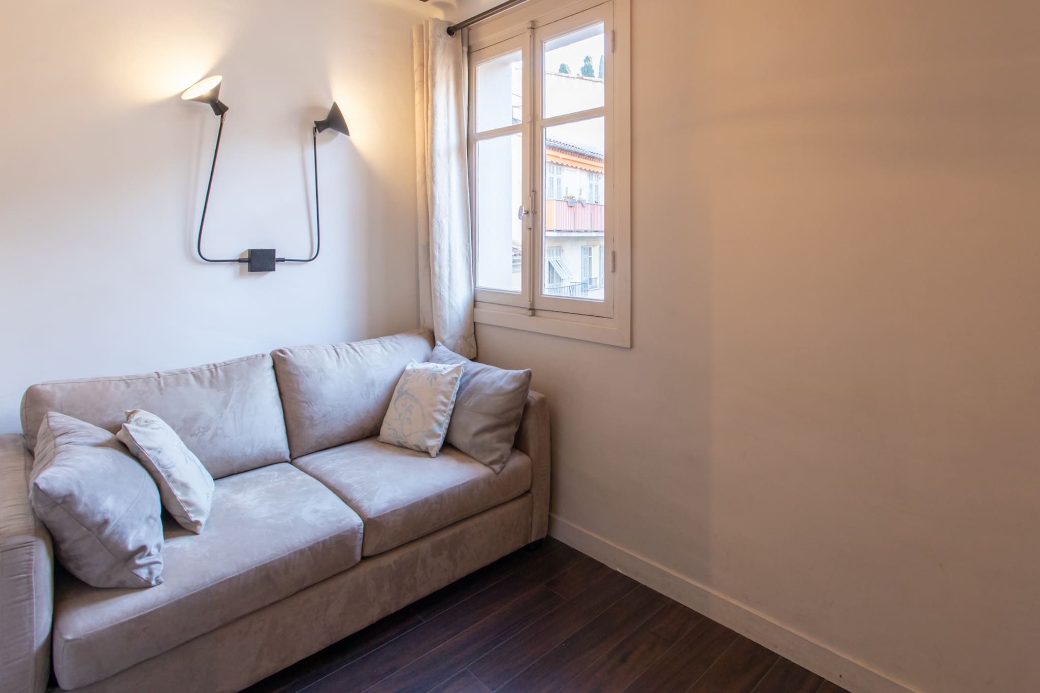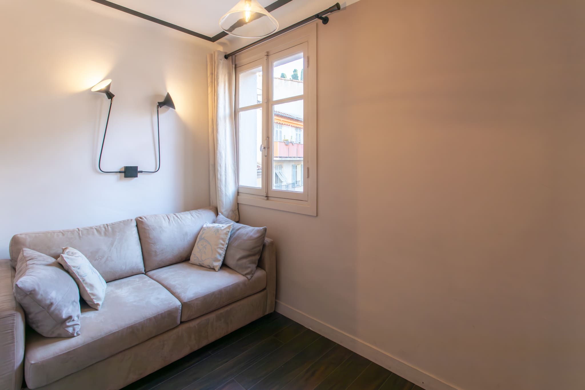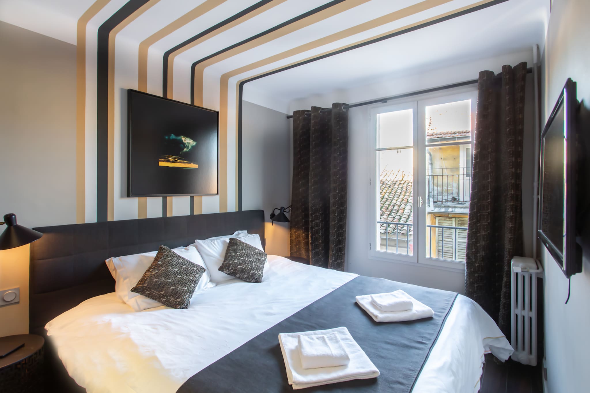 . Une troisième chambre équipée d’un canapé lit double 140cm, de lampes liseuse, fenêtre donnant vue sur les escaliers de place du caret