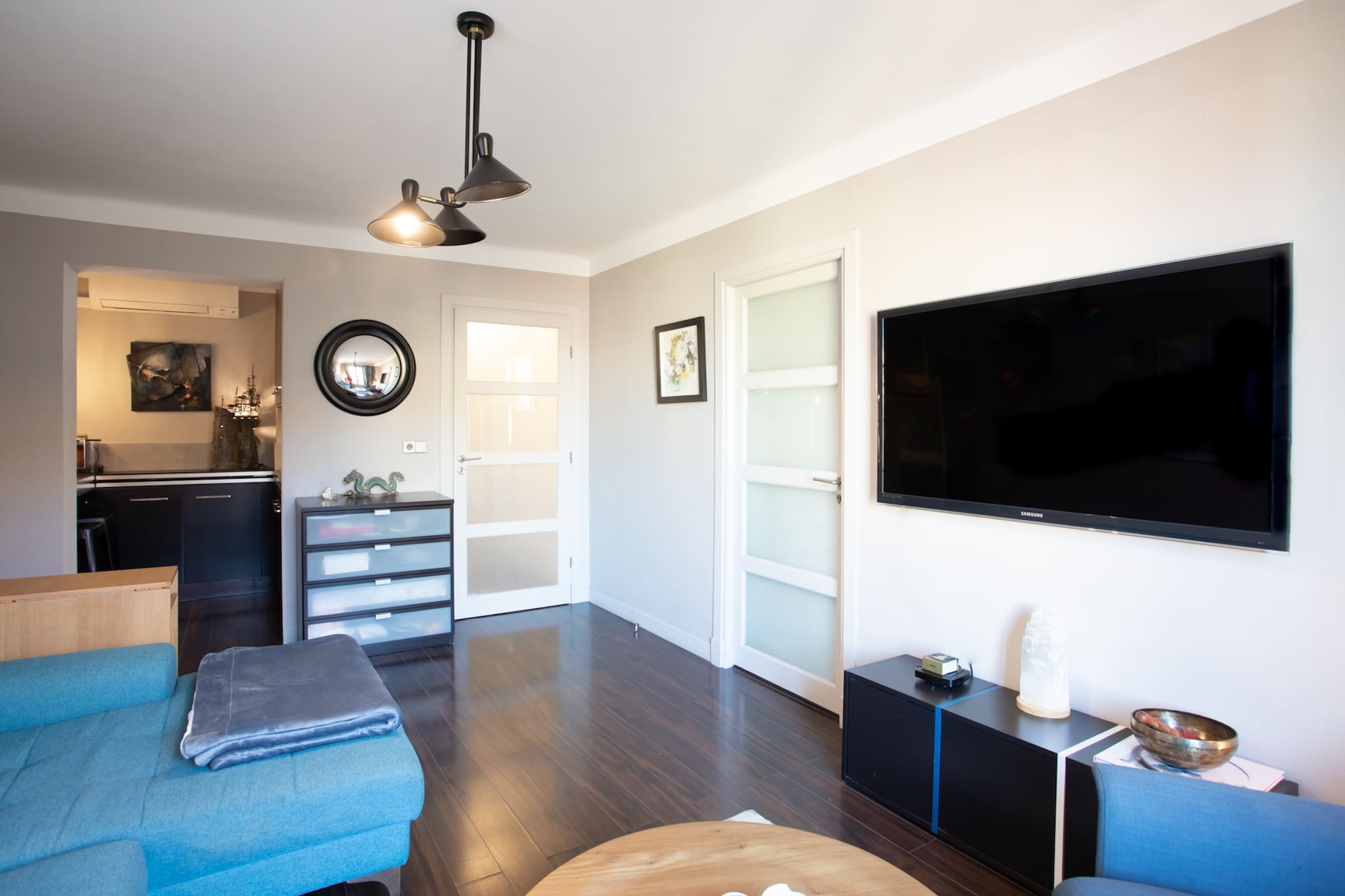 . Un espace salon décoré avec soin équipé de la clim réversible, de 2 canapés canapé, d’une table basse, d’une TV et sa console
