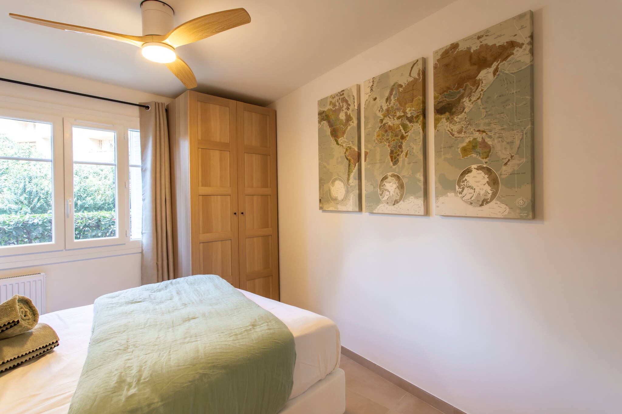 . Une première chambre équipée d’un lit double 140cm, d’un ventilateur de plafond, de tables et lampes de chevets, placard de rangement, fenêtre double vitrage donnant sur la cour et le parking de la résidence, rideaux filtrants et volets manuels