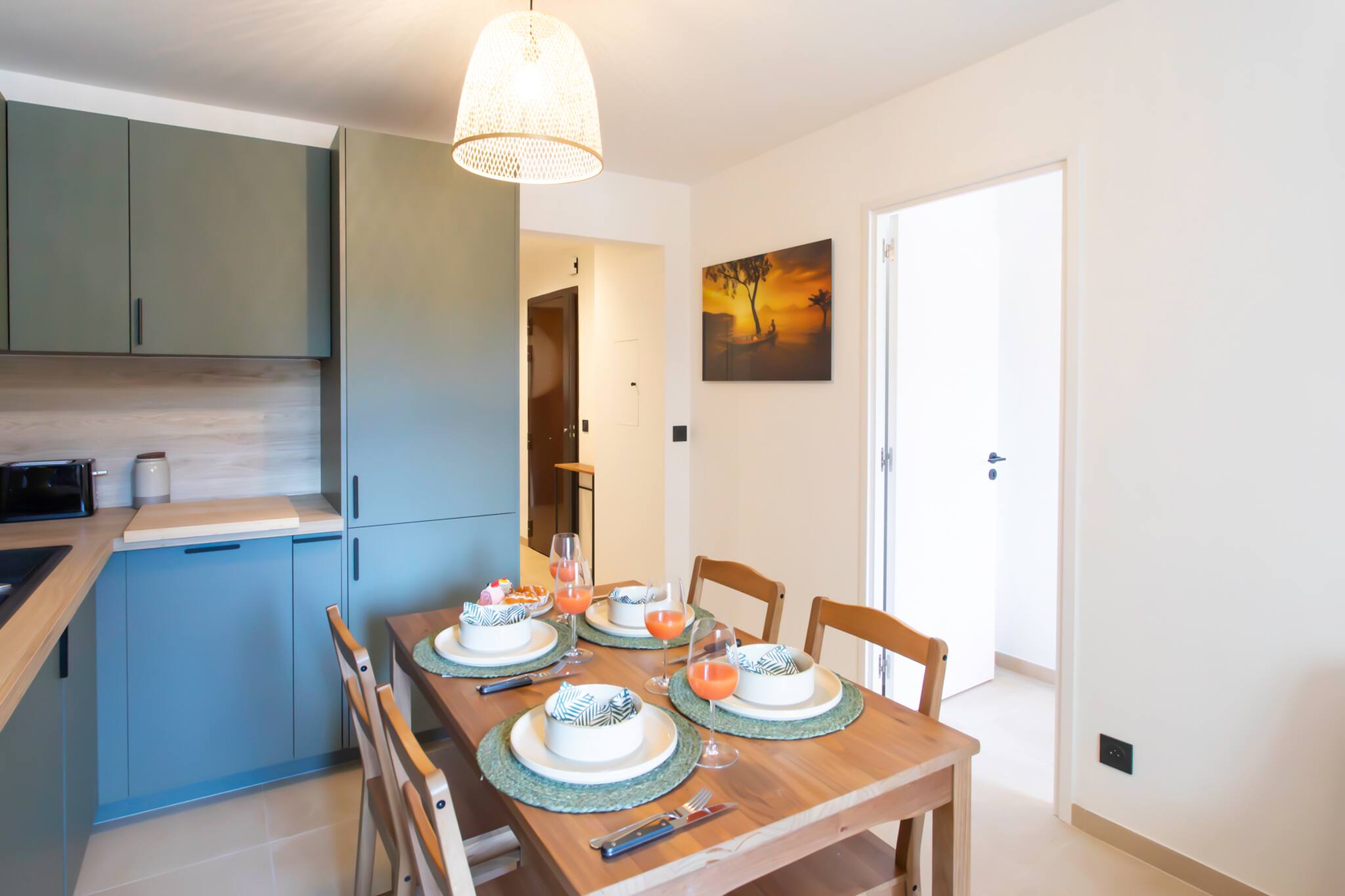 . Une cuisine entièrement équipée : Frigo ; congélateur, four, micro-onde, lave-vaisselle, cafetière Nespresso, bouilloire électrique, grille-pain, évier, plan de travail, un kit pour cuisiner, vaisselle, couverts et espaces de rangements