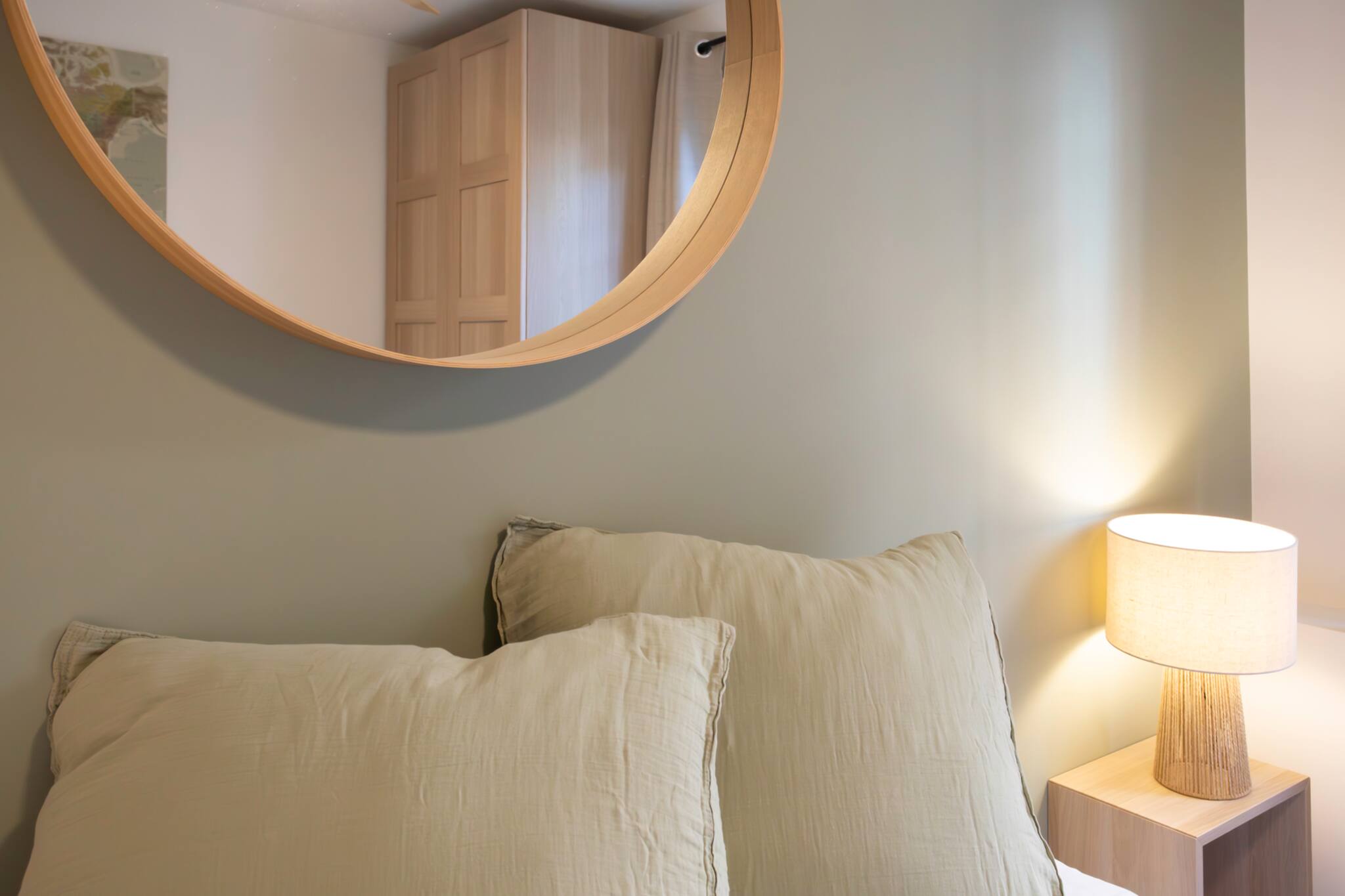 . Une chambre parentale climatisée avec lit double de 180cm, rideaux et fenêtre double vitrage, table de nuit & lampes de chevets, placards de rangements, miroir, tapis et pouf