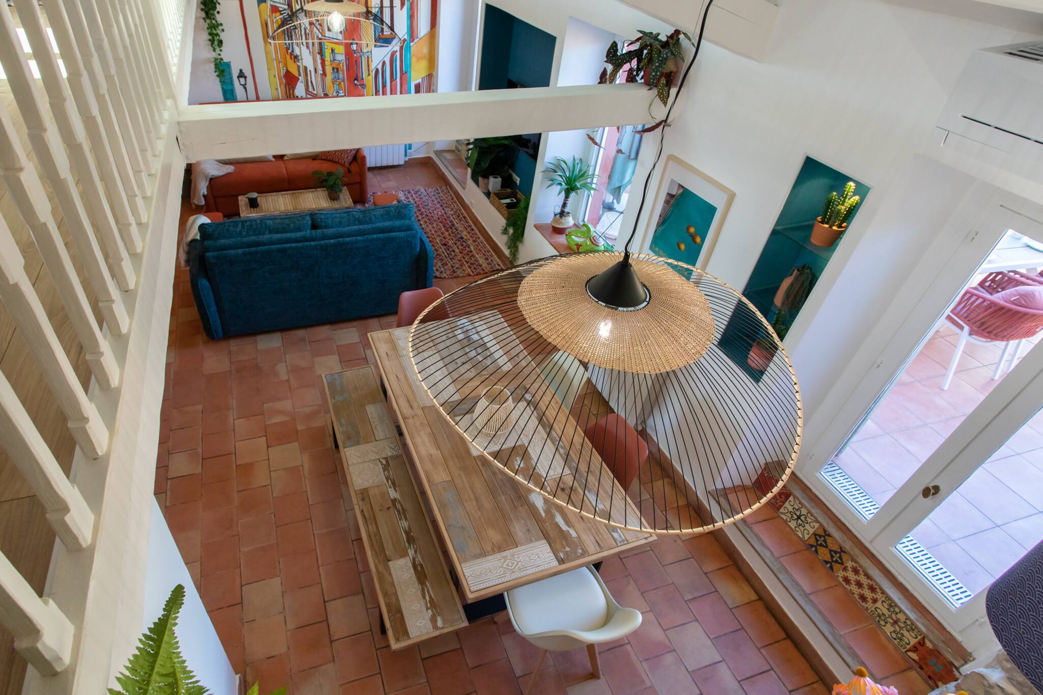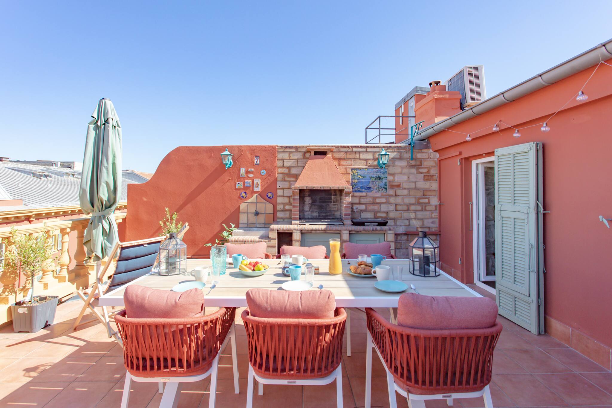. Une grande terrasse de 40m² avec vue dégagée sur la ville et les montagnes, équipée de mobilier extérieur: salon de jardin (canapé & fauteuils), transats, table repas extérieur pour 6 personnes, planche de cuisson, lumières murales et décoration