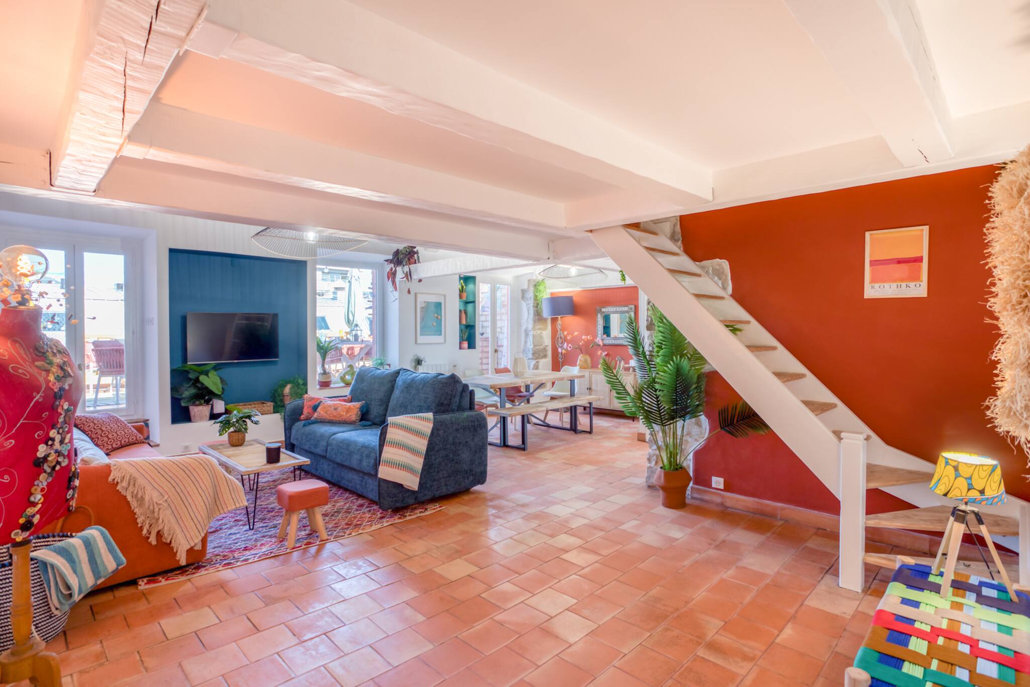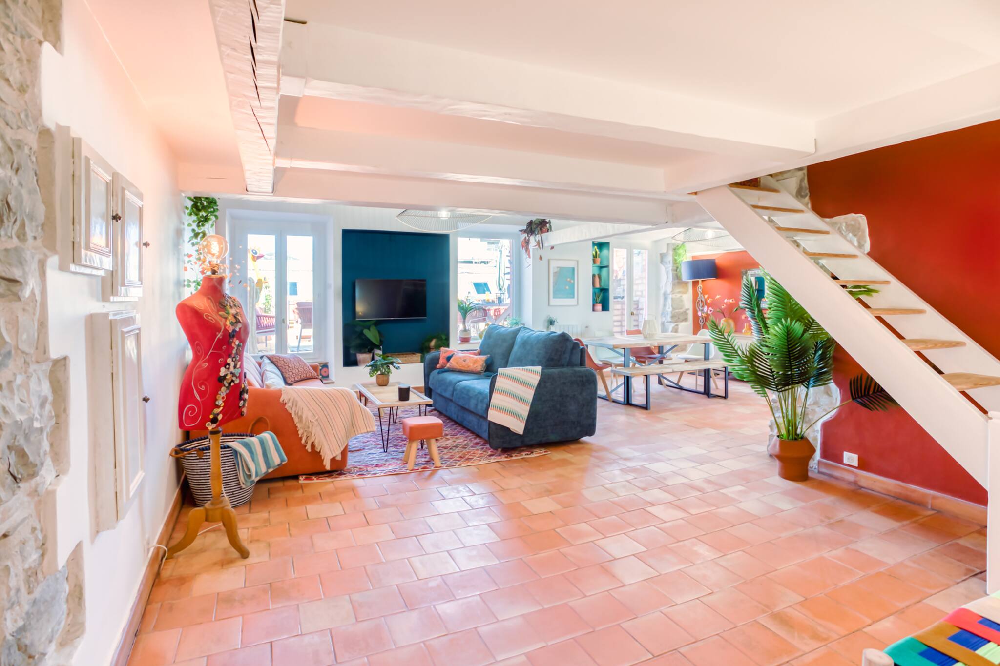 . Espace salon équipé d’un canapé d’angle, table basse, TV, table repas pour 6 personnes et chaises accès grands balcon