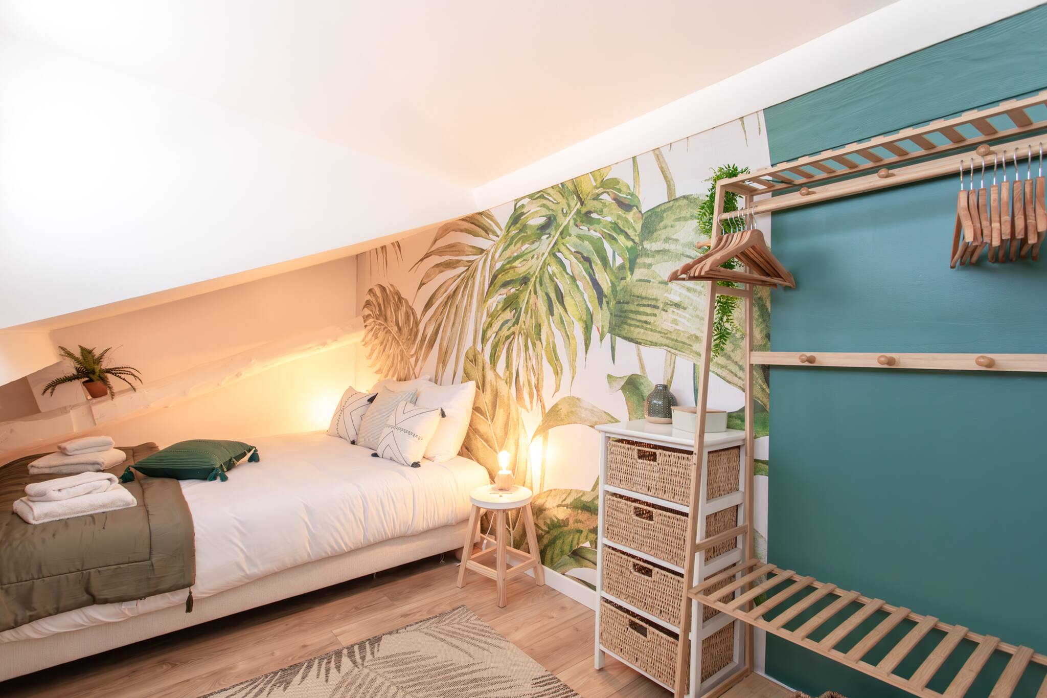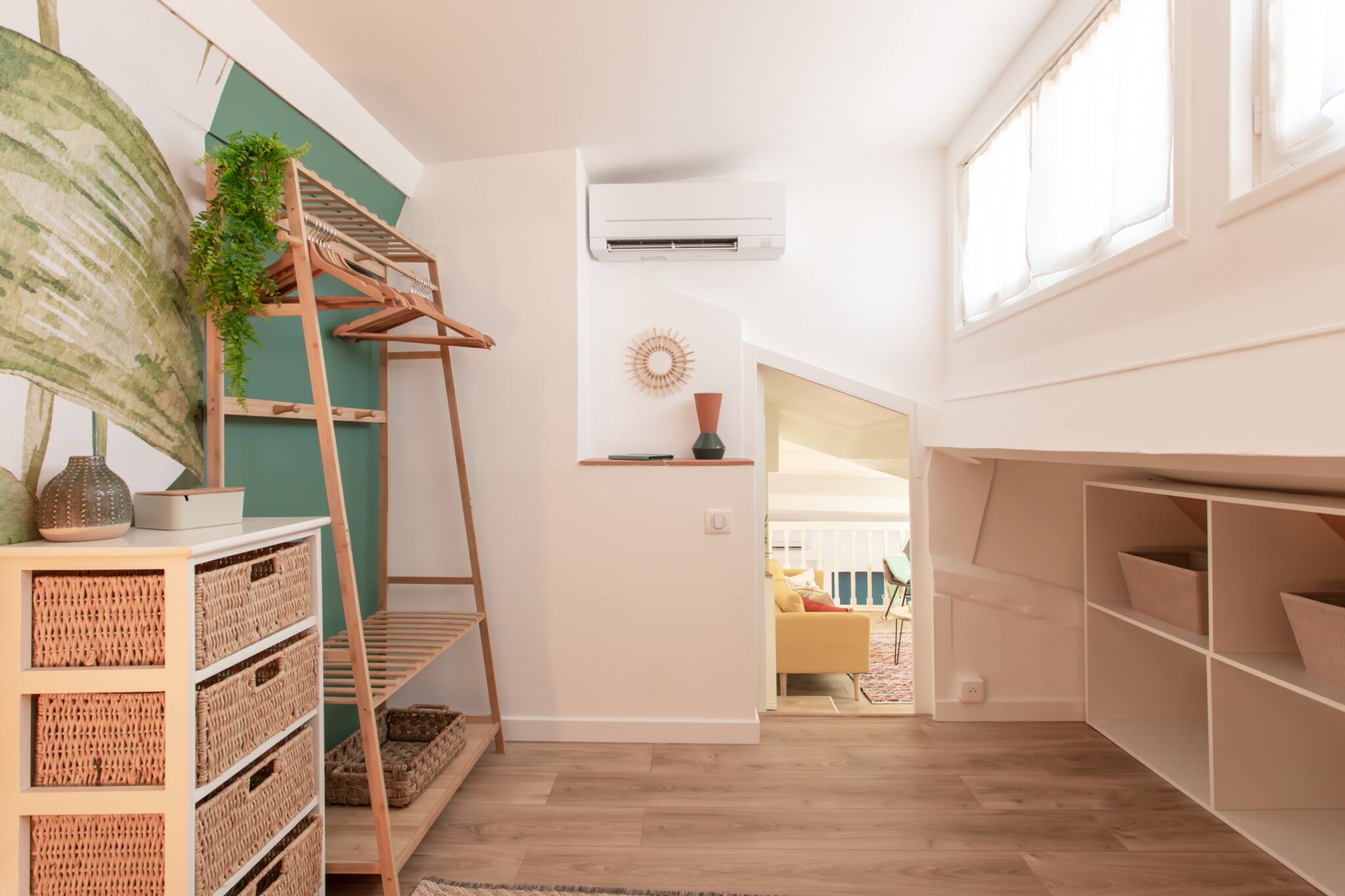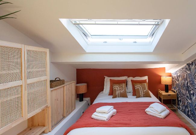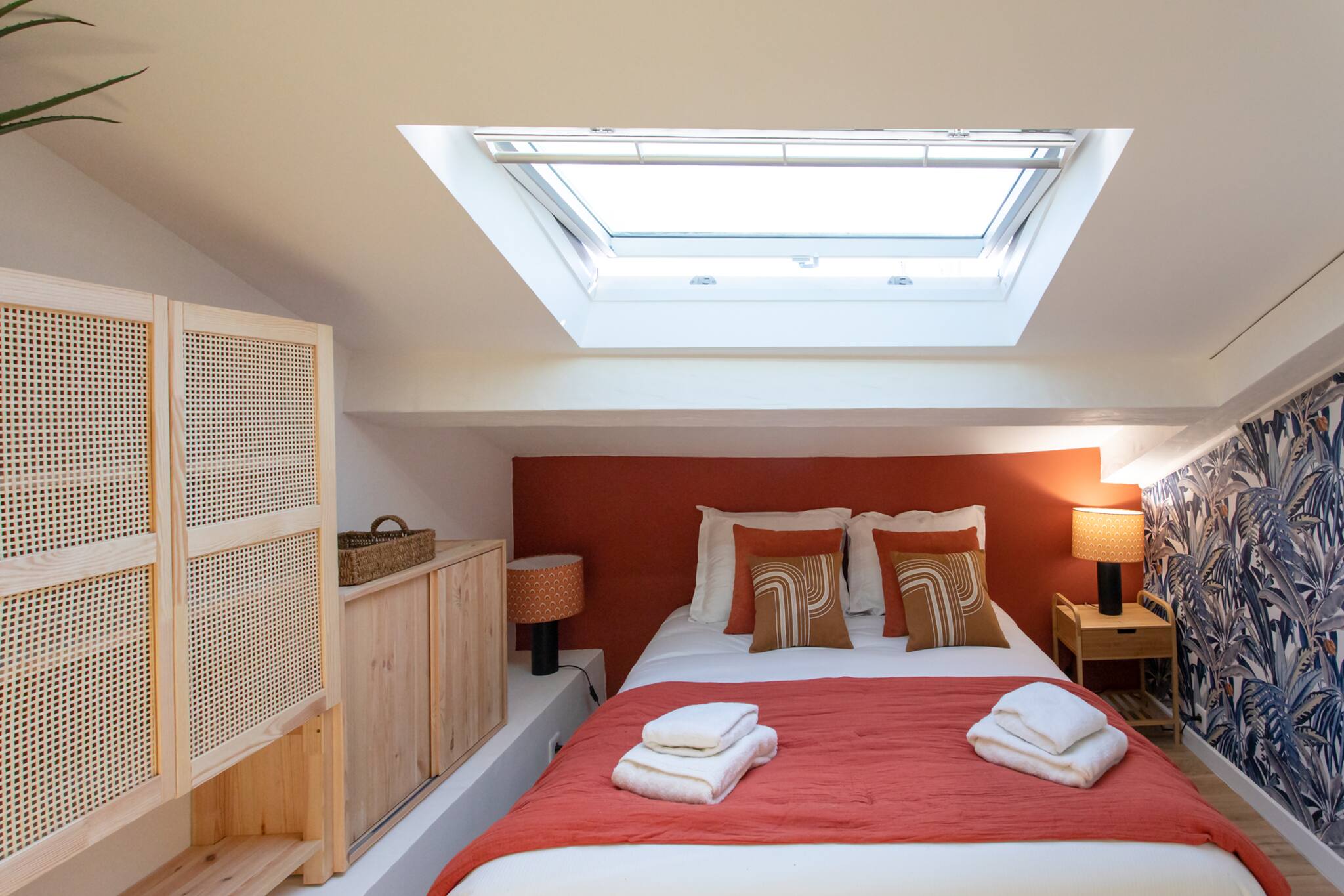 . Une deuxième chambre en mezzanine climatisée avec une lit double 160cm, table de nuit & lampe de chevet, meubles de rangements, rideaux, fenêtre double vitrage