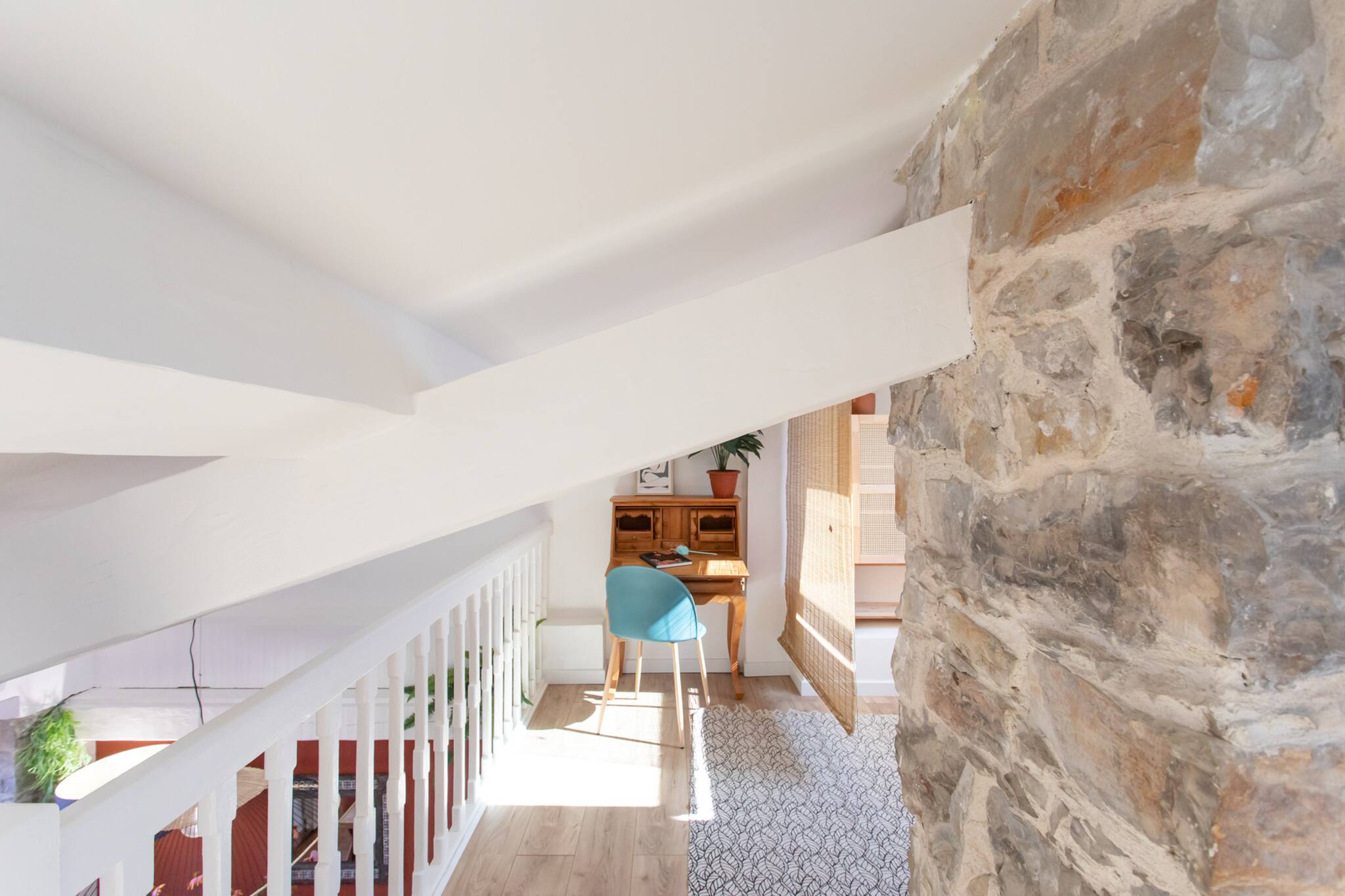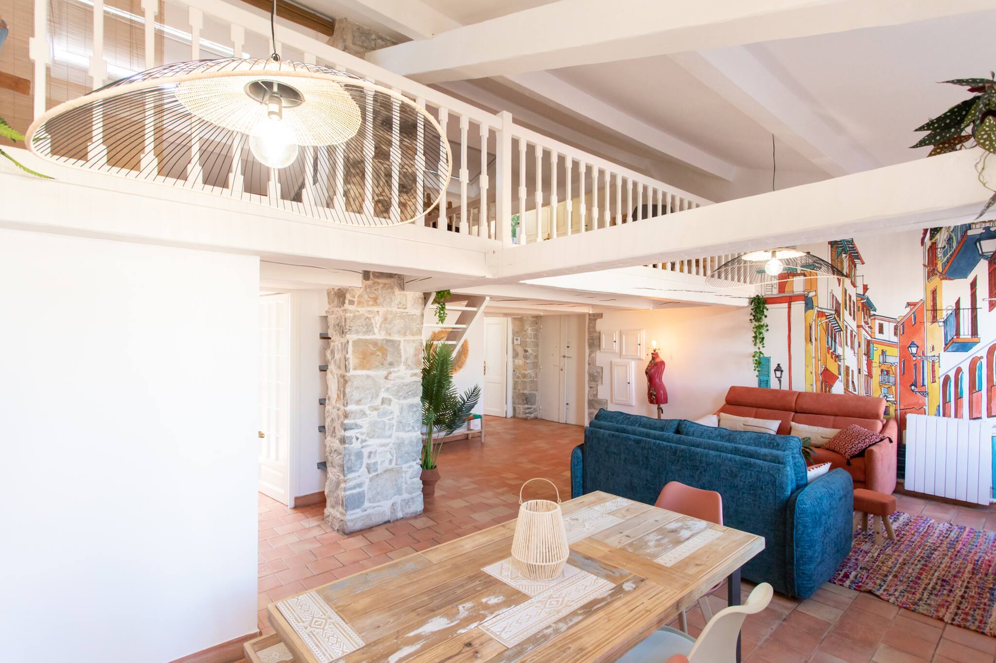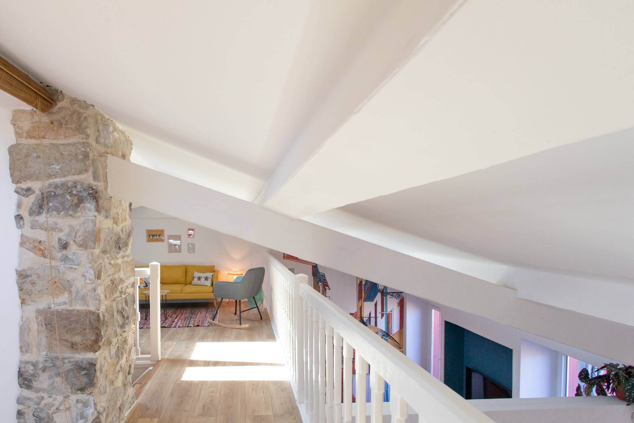 . Une deuxième chambre en mezzanine climatisée avec une lit double 160cm, table de nuit & lampe de chevet, meubles de rangements, rideaux, fenêtre double vitrage