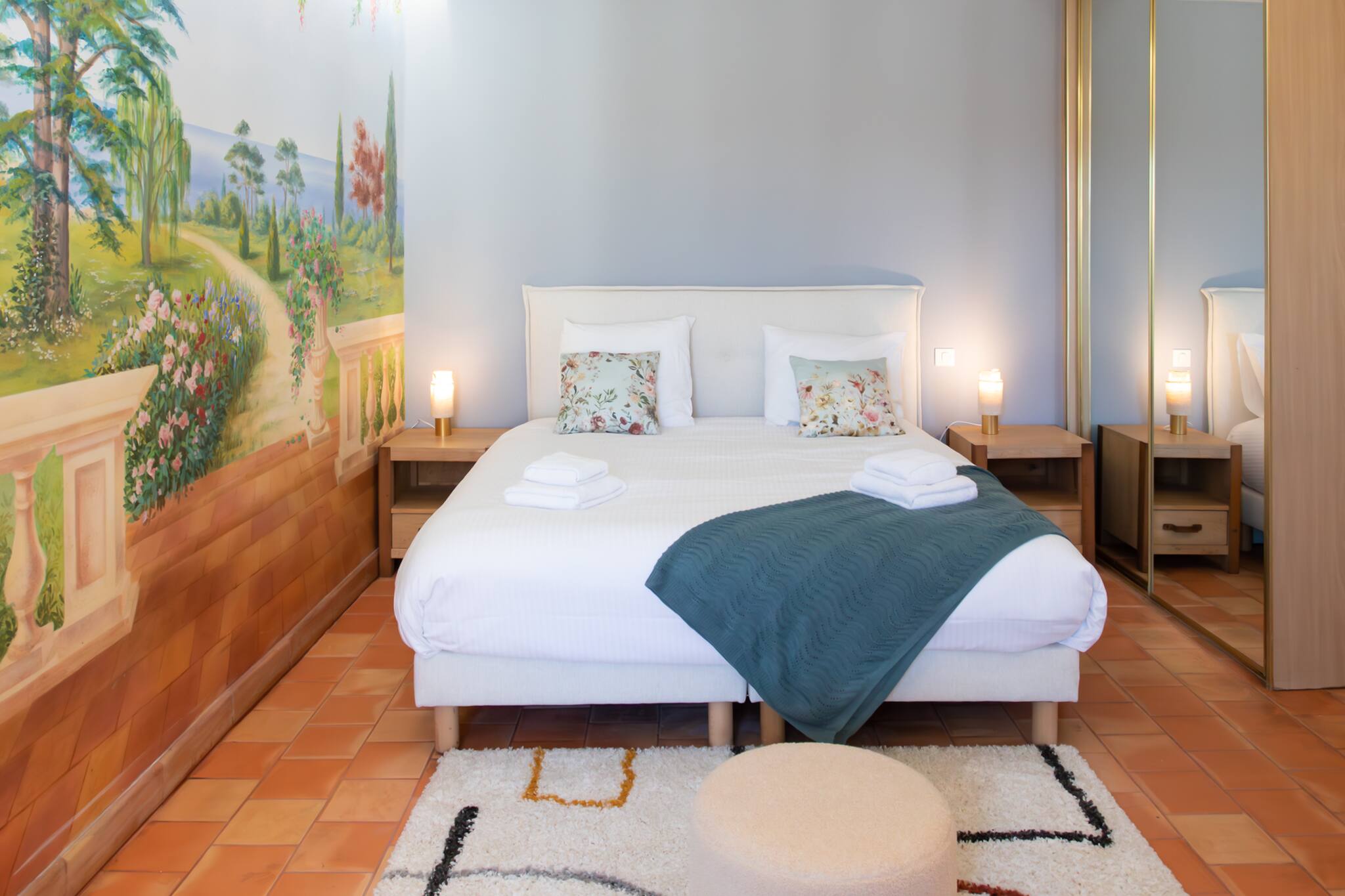 . Une chambre parentale climatisée avec lit double de 180cm, rideaux et fenêtre double vitrage, table de nuit & lampes de chevets, placards de rangements, miroir, tapis et pouf