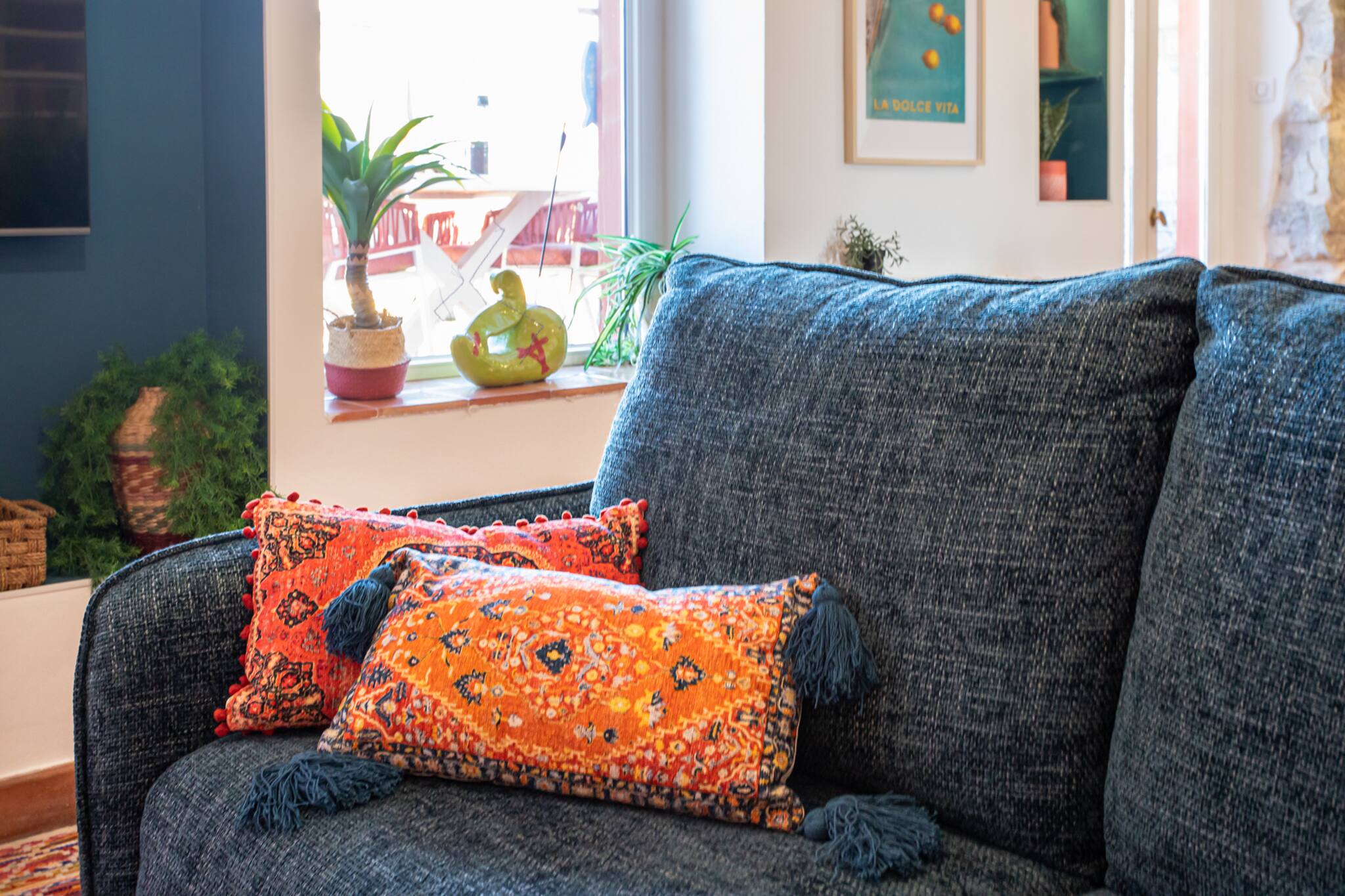 . Un espace salon décoré avec soin équipé de la clim réversible, de 2 canapés canapé, d’une table basse, d’une TV et sa console