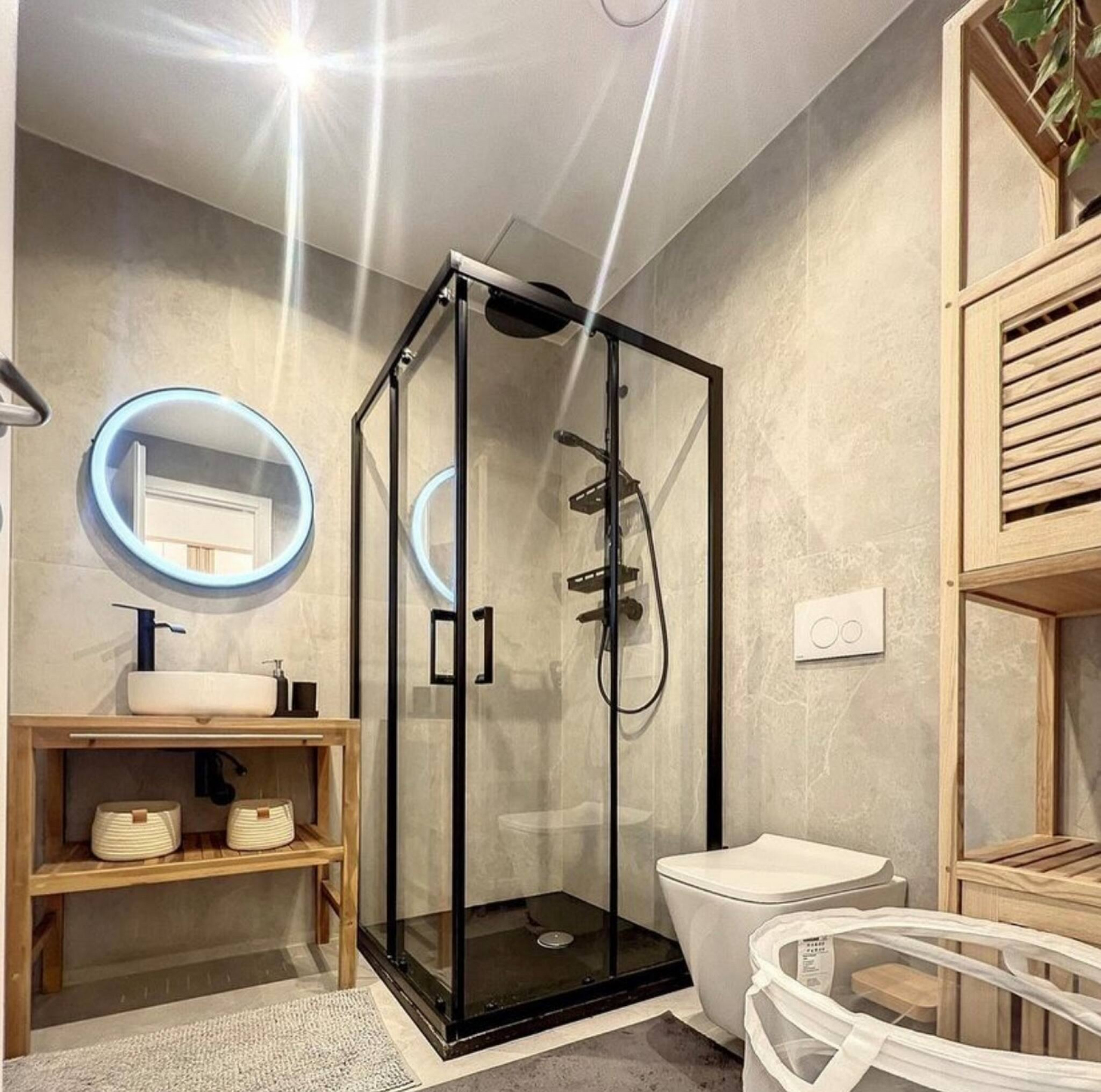 - Une salle de bain avec douche, lavabo, sèche-cheveux, miroir, lave-linge et WC