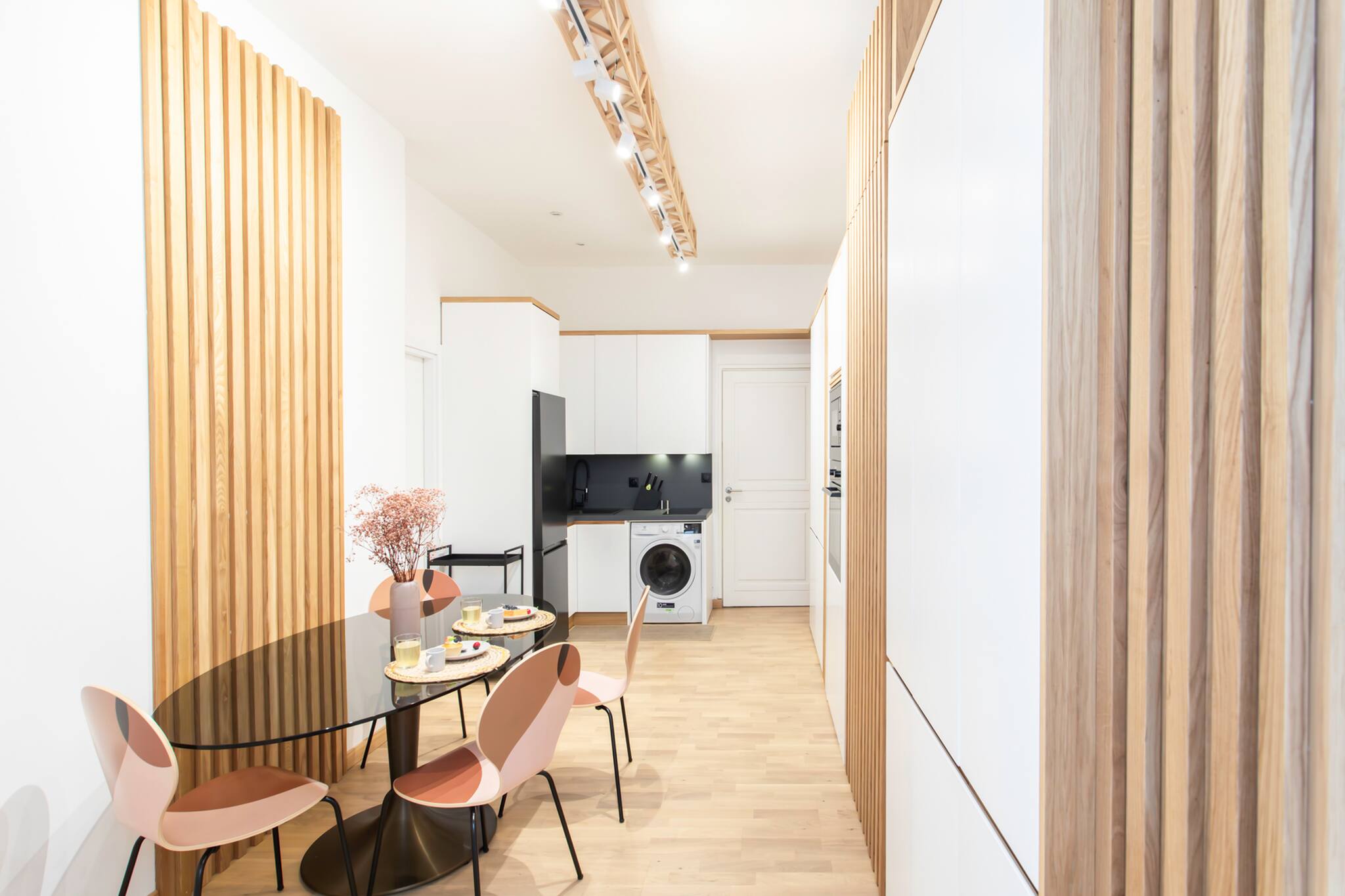- Une cuisine américaine entièrement équipée avec réfrigérateur avec congélateur, plaques de cuisson, hotte aspirante, micro-ondes, lave-vaisselle, cafetière Nespresso, bouilloire, grille-pain et kit de cuisson