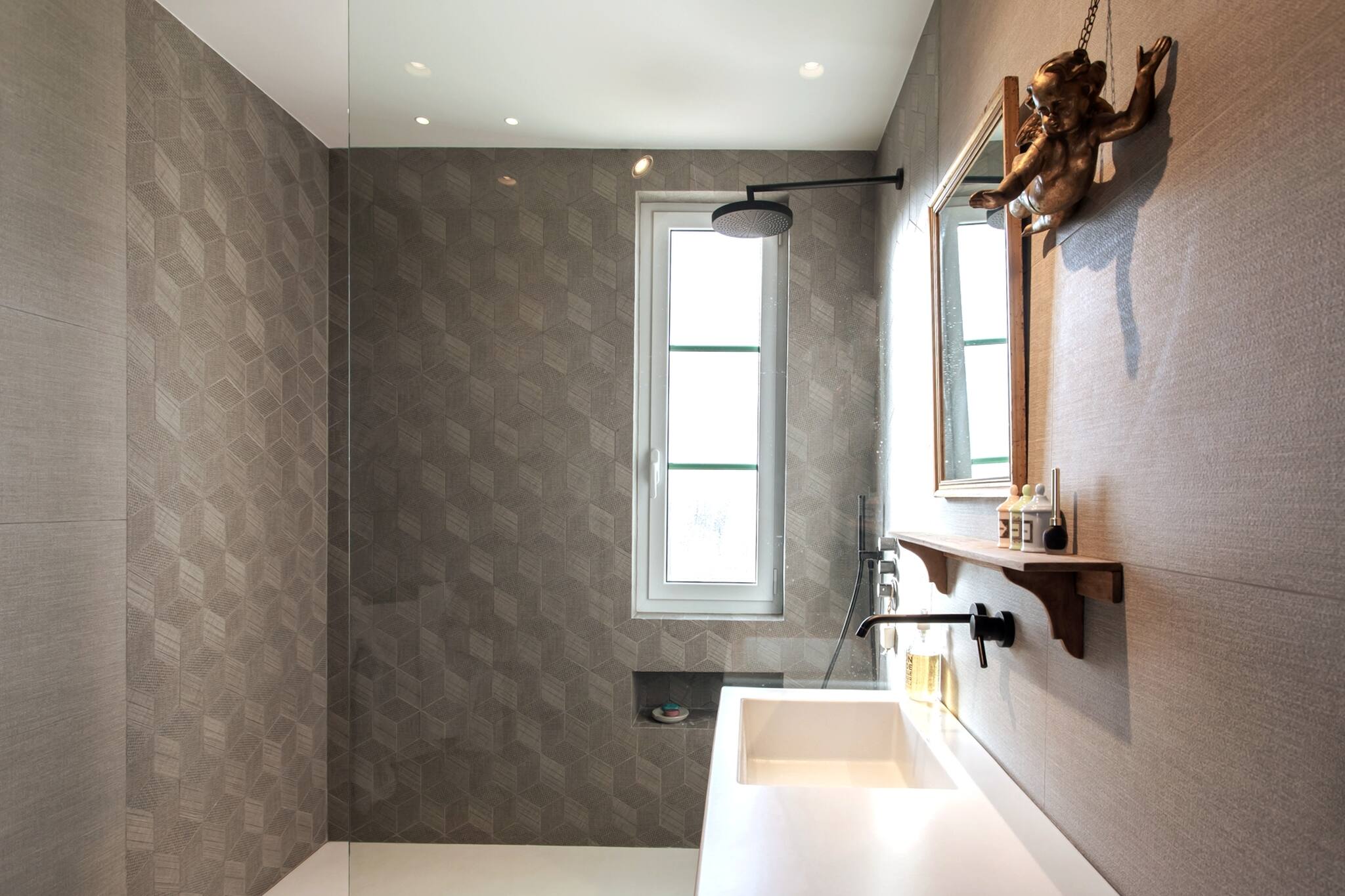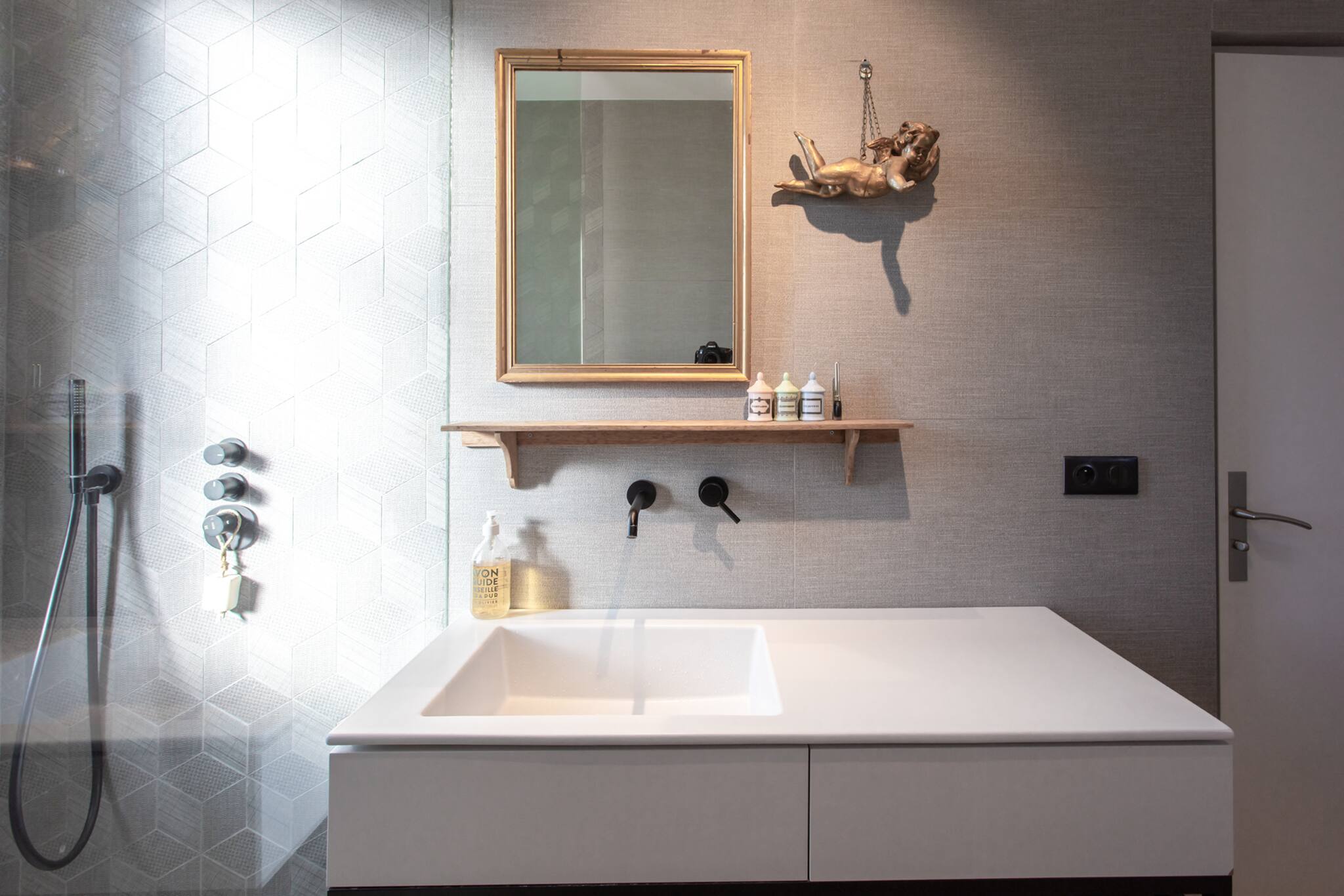 • Une salle de bain attenante à la pièce du couchage d’appoint (avec un angle variant de 1m67 à 2m de hauteur) équipée d’une douche à l’italienne, d’une vasque et d’un sèche-cheveux
