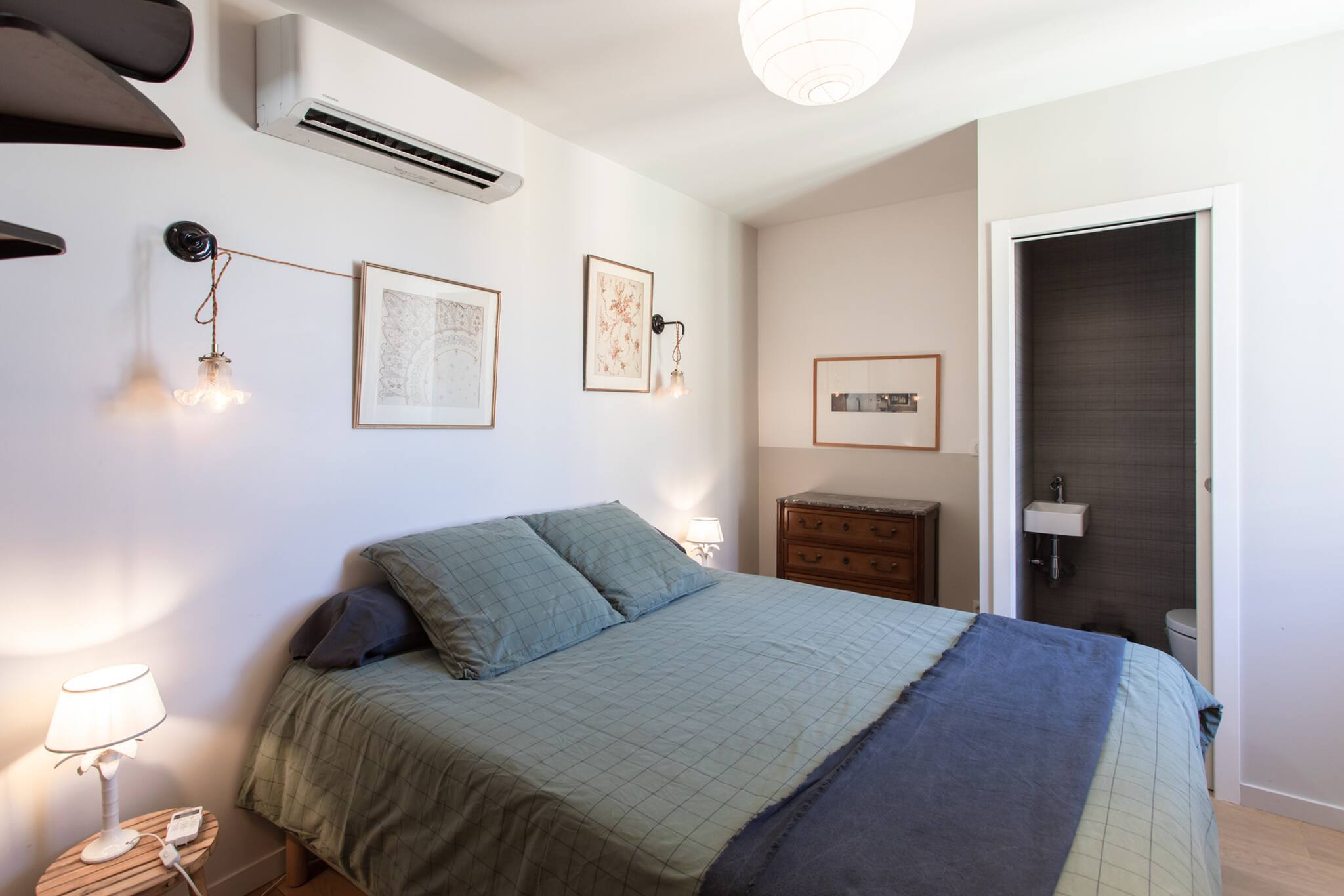 . Une chambre parentale climatisée avec lit double de 180cm, rideaux et fenêtre double vitrage, table de nuit & lampes de chevets, placards de rangements, miroir, tapis et pouf