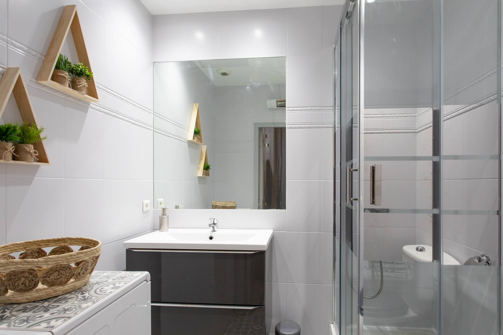 . Une salle de douche équipée d’une cabine de douche, d’une vasque, d’un sèche-cheveux, miroirs et Wc