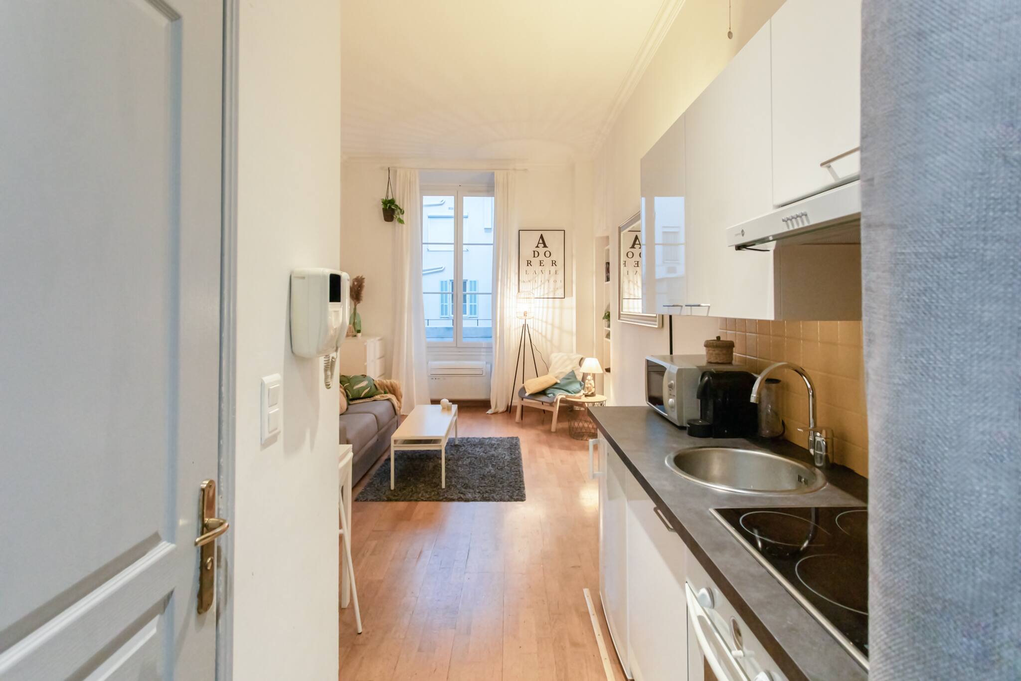 Ce lumineux studio de 22m² au design contemporain hautement soigné dispose de tous le confort pour rendre agréable votre séjour à Nice (clim, tv , wifi, etc). Situé au 1er étage sans ascenseur d’un immeuble Niçois typique il offre une vue sur cours calme. Situé sur l’avenue Jean Médecin il est à seulement 4 minutes à pied du Vieux Nice et de la Promenade des Anglais et de la Mer. Il vous permettra d’explorer la ville entièrement à pied. Pour un séjour en amoureux ou entre amis, c’est idéal !