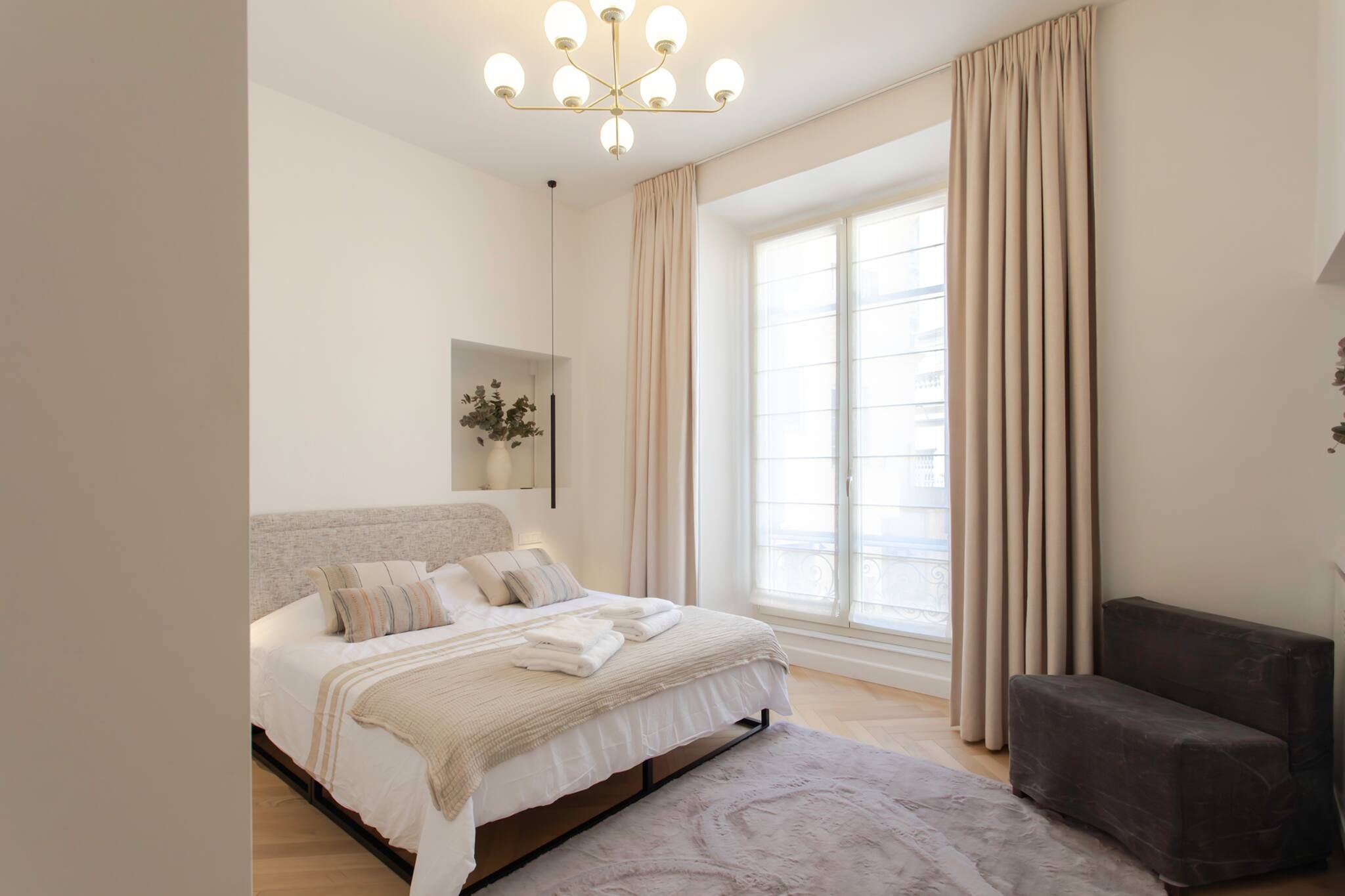 . Une chambre parentale climatisée avec lit double de 180cm, rideaux et fenêtre double vitrage, table de nuit & lampes de chevets, placards de rangements, miroir, tapis et pouf
