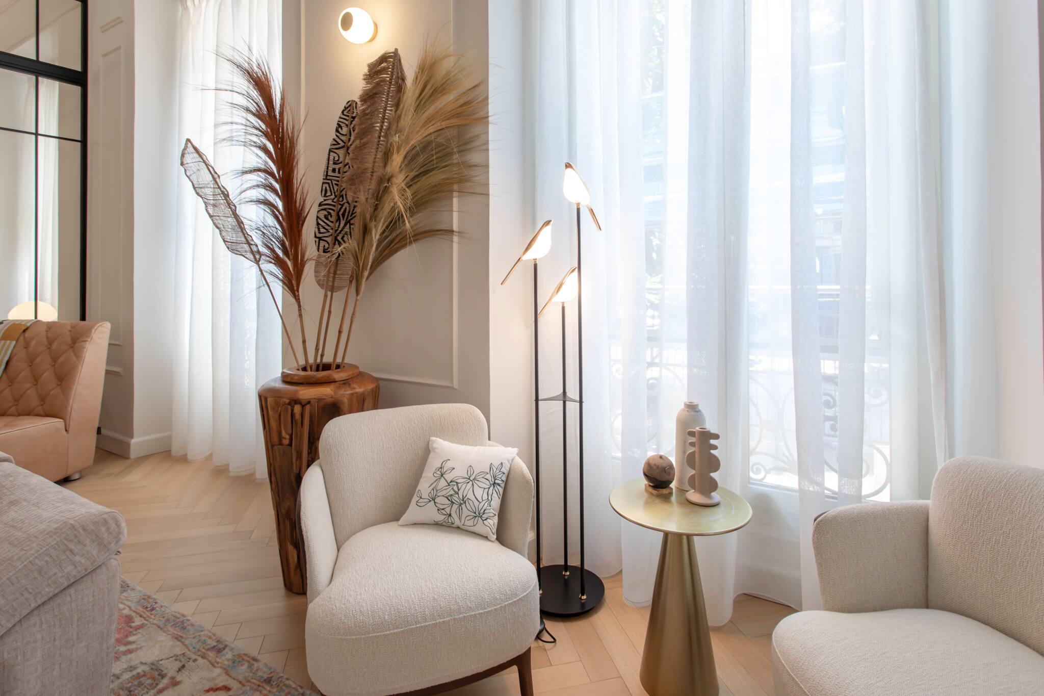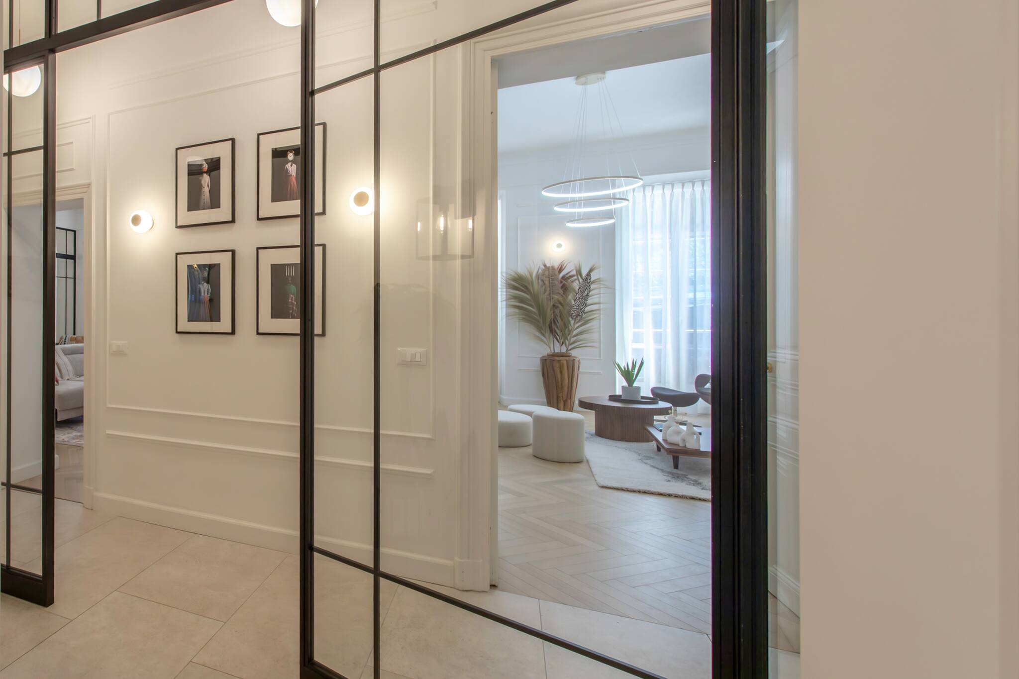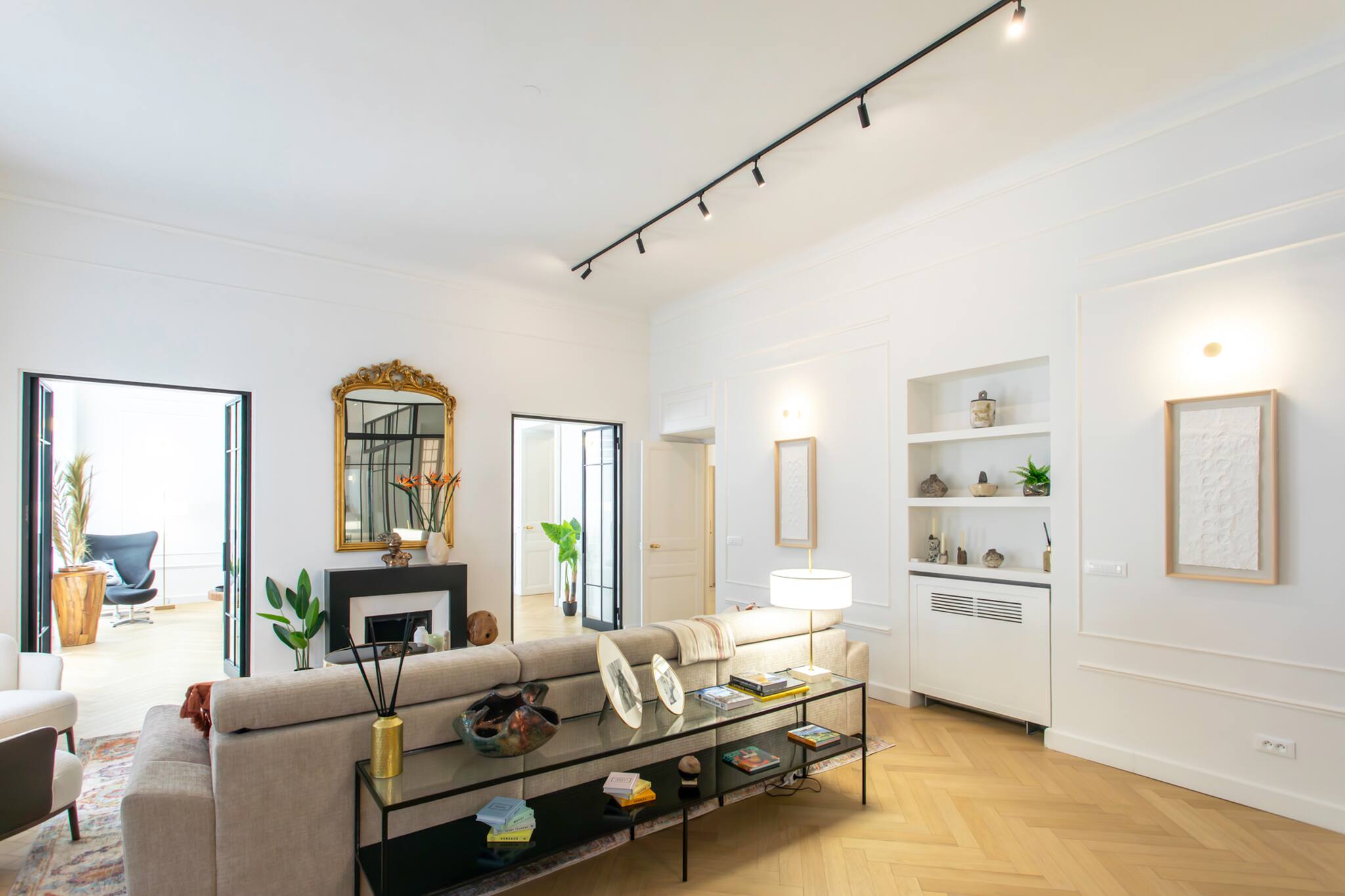 . Un premier salon, (le salon tv) équipé de climatisation réversible, TV, meuble Tv tables basses, canapés trois places, fauteuils, décoration, deux grandes fenêtres doubles vitrages avec vue sur la cour de ‘l’immeuble et le Boulevard Victor Hugo, deux doubles porte vitrée menant au salon de réception