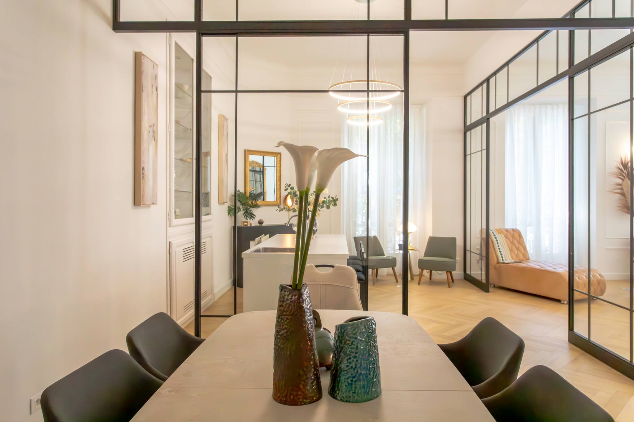 . Une grande cuisine équipée d’un magnifique ilot central avec plaques inductions et hôtes aspirantes au sols, climatisation réversible, Frigo américain, évier, machine à café à grains, cave à vin électrique, four micro-onde, four chaleur tournante, bouilloire électrique grille-pain, TV murale, enceintes murales, climatisation réversible fauteuils, tabourets rangements, un kit pour cuisiner et vaisselle