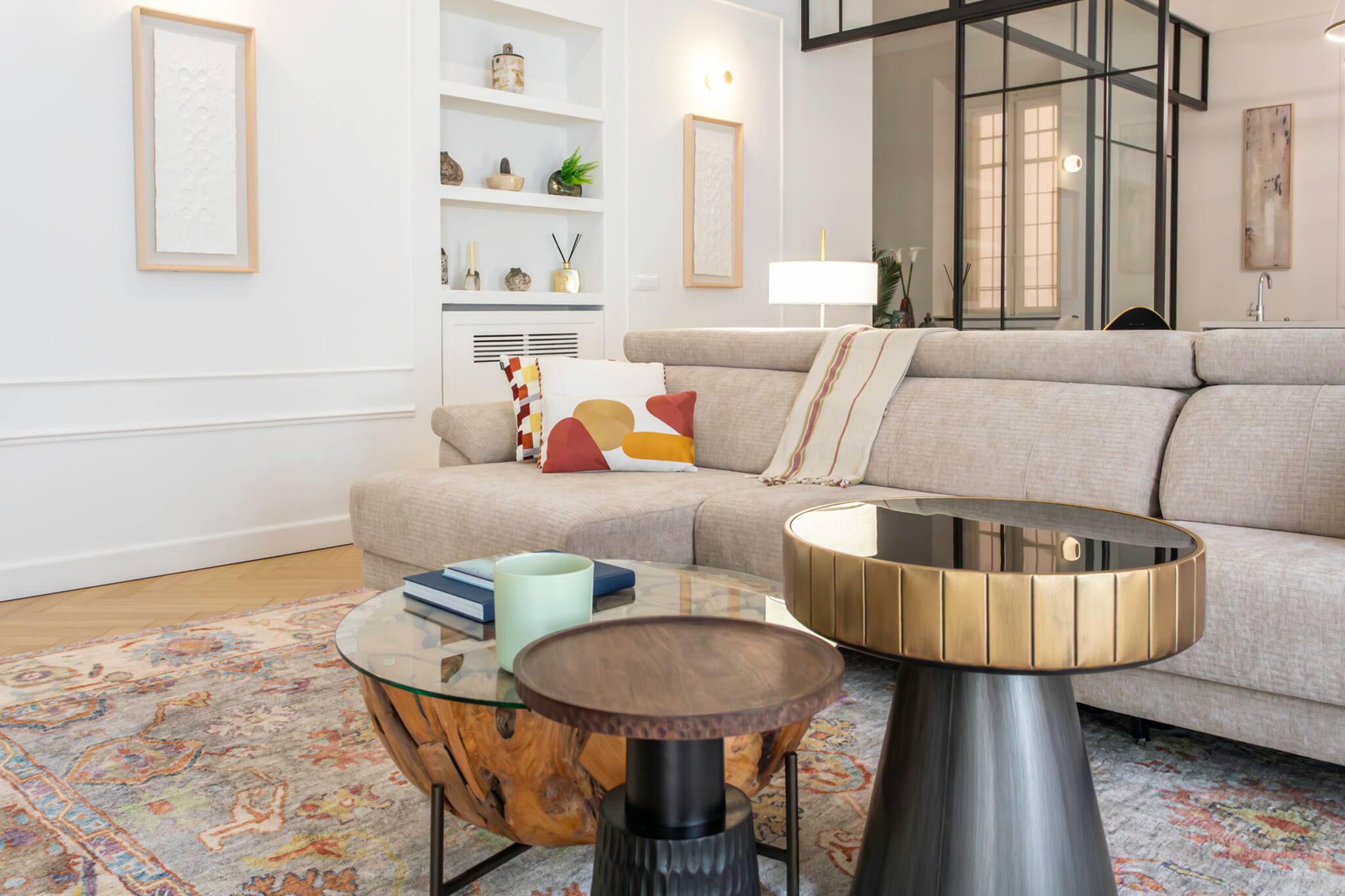 . Un espace salon décoré avec soin équipé de la clim réversible, de 2 canapés canapé, d’une table basse, d’une TV et sa console