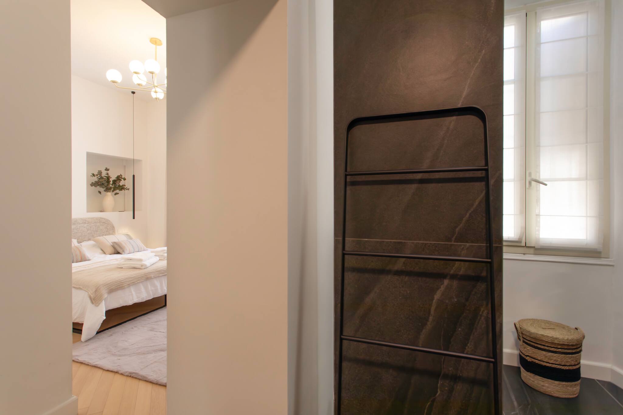 . Une première suite parentale avec un lit double 180cm, climatisation réversible, fauteuil, tables de nuits et liseuses, grande fenêtre double vitrage donnant sur l’arrière-cours de l’immeuble, rideaux filtrants et occultants, TV, un grand dressing équipé de placards de rangement, une salle de douche privative équipée de vasque et meuble, WC, miroir, sèche-cheveux, sèche serviette, une magnifique douche à l’italienne