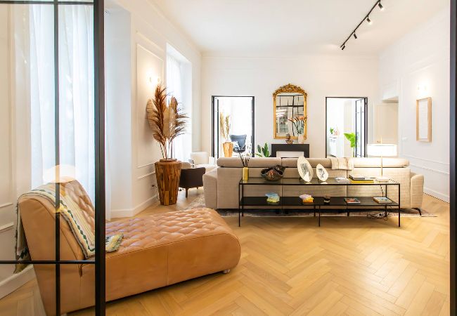 Ce splendide logement de 220m² est idéale. Situé au rez de chaussée surélevée d'un Palais Niçois, Il accueillera confortablement 7 personnes grâce à ses 2 suites parentales et sa chambre triple. 3 salles de bains, 2 salons, un espace bar et un espace diner complèterons l’ensemble qui est distribué sur deux niveaux dont un en entre-sol. L’intérieur offre une décoration soignée et moderne pour profiter de tous ses espaces. Climatisation réversible, Wifi, à 10 mins à pieds de La Prom & de la Mer.