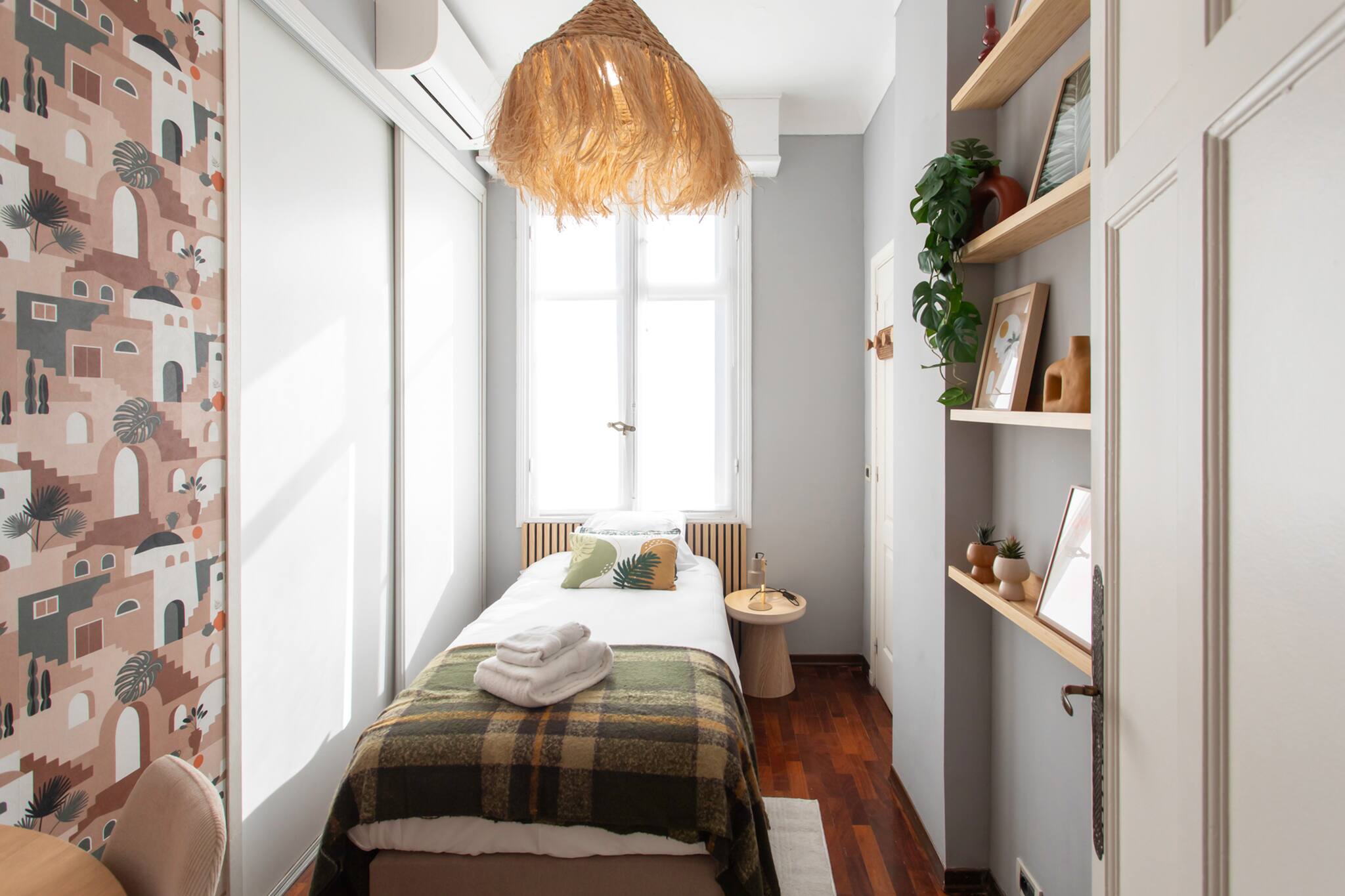 🛏️ Chambre 2 : lit Simple (140 cm), une tables de chevet avec lampes, un bureau avec chaise et espace de rangement.