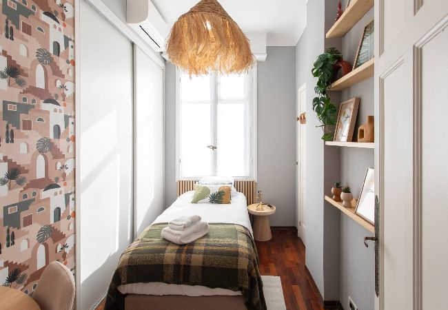 . Une deuxième chambre avec lits superposés simple 90cm, ces lits sont plus adaptés à des enfants que des adultes avec table de nuits et lampes de chevet, placard et climatisation réversible, fenêtre sur rue avec double vitrage