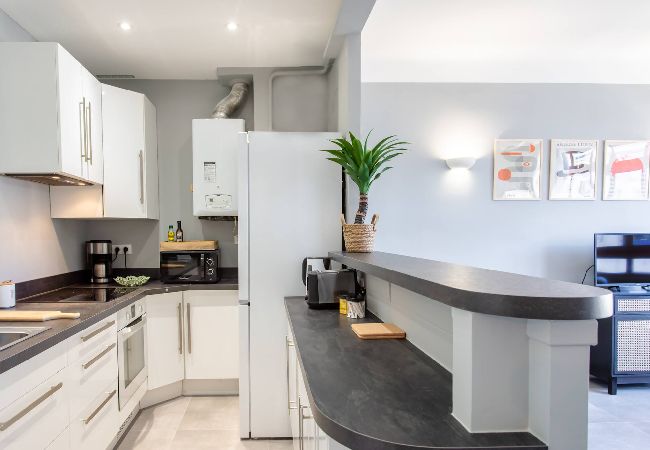 . Une cuisine ouverte sur le salon entièrement équipée : Frigo, compartiment congélateur, four micro-onde, cafetière Nespresso, bouilloire électrique, grille-pain, évier, plan de travail un kit pour cuisiner, vaisselle, couverts et espaces de rangements