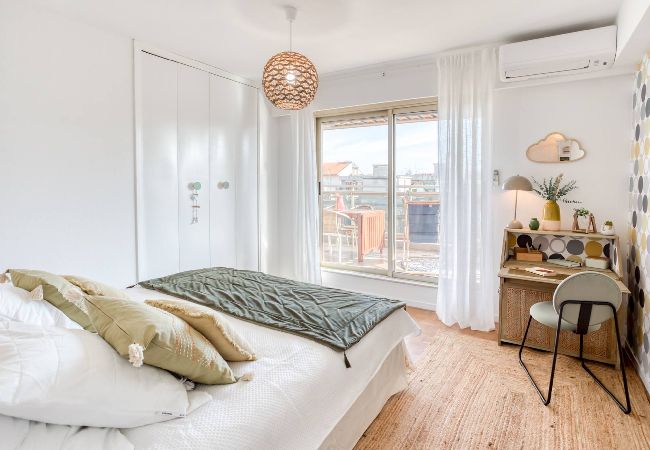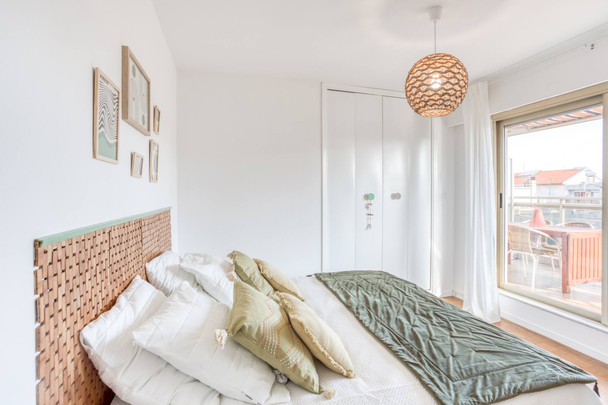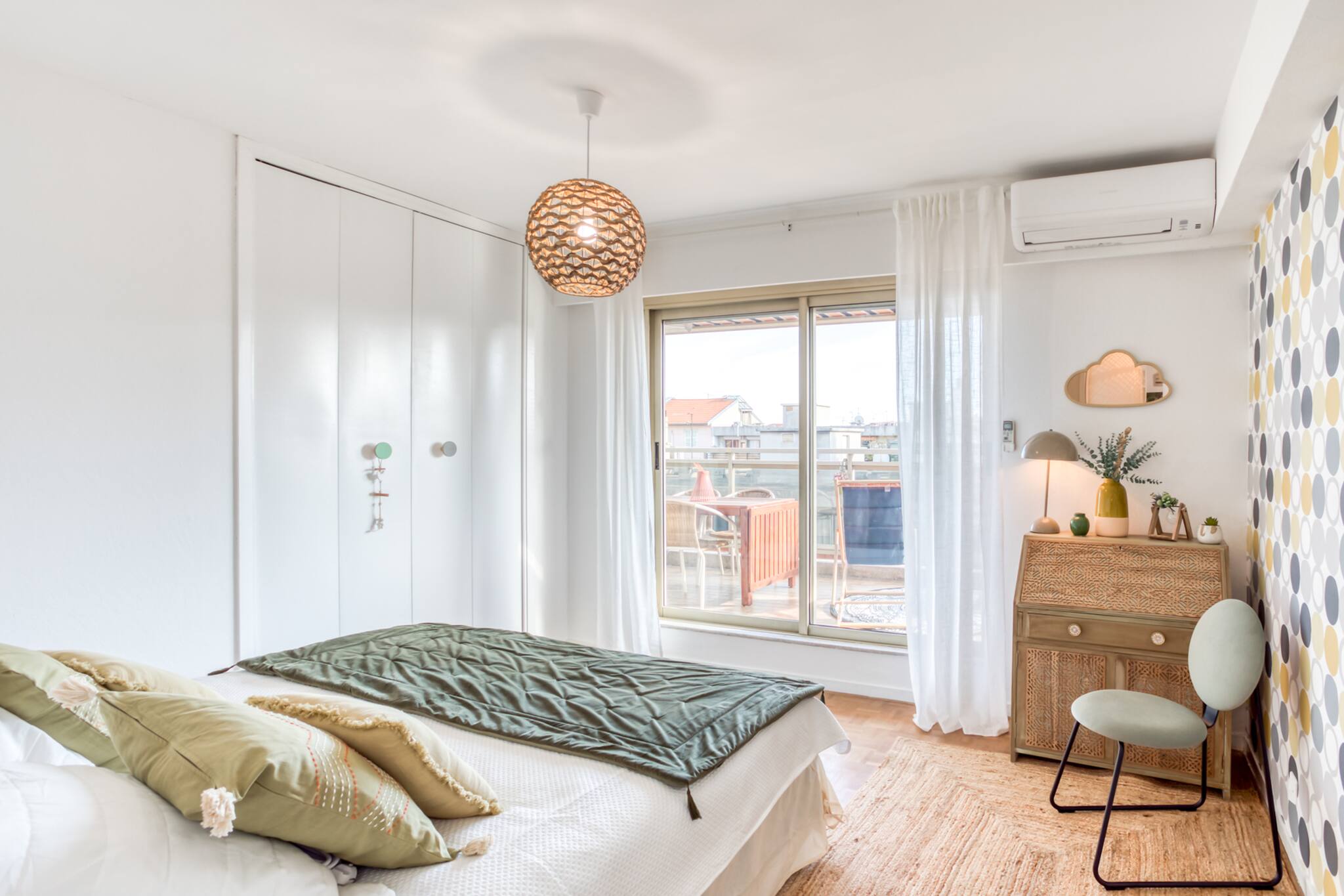 . Une première chambre climatisée avec lit double de 180cm, placards de rangements, rideaux et baie vitrée donnant sur le balcon, coiffeuse et chaise pouvant servir de bureau