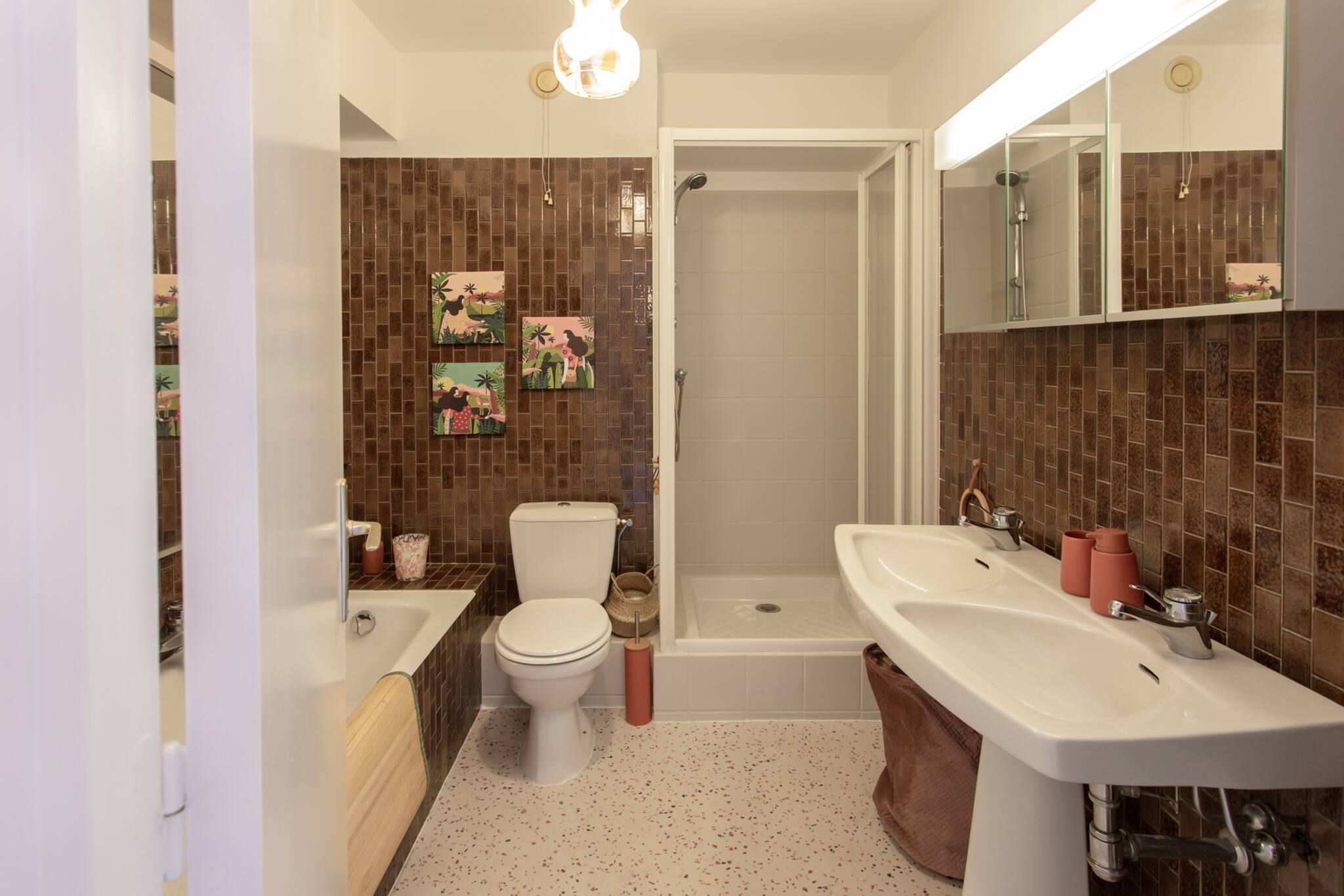 . Une salle de bain avec douche et baignoire, double vasque, sèche-cheveux, sèche serviette et WC