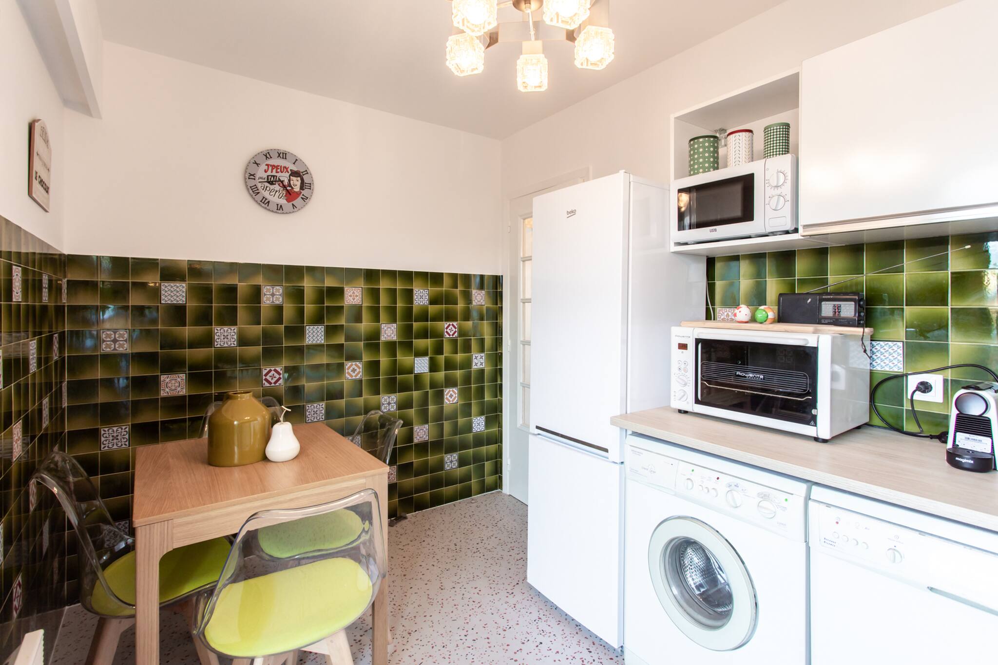 . Une cuisine équipée : Frigo et compartiment congélateur, four, machine à laver, cafetière Nespresso, bouilloire électrique, grille-pain, évier, plan de travail, un kit pour cuisiner, vaisselle, couverts et espaces de rangements