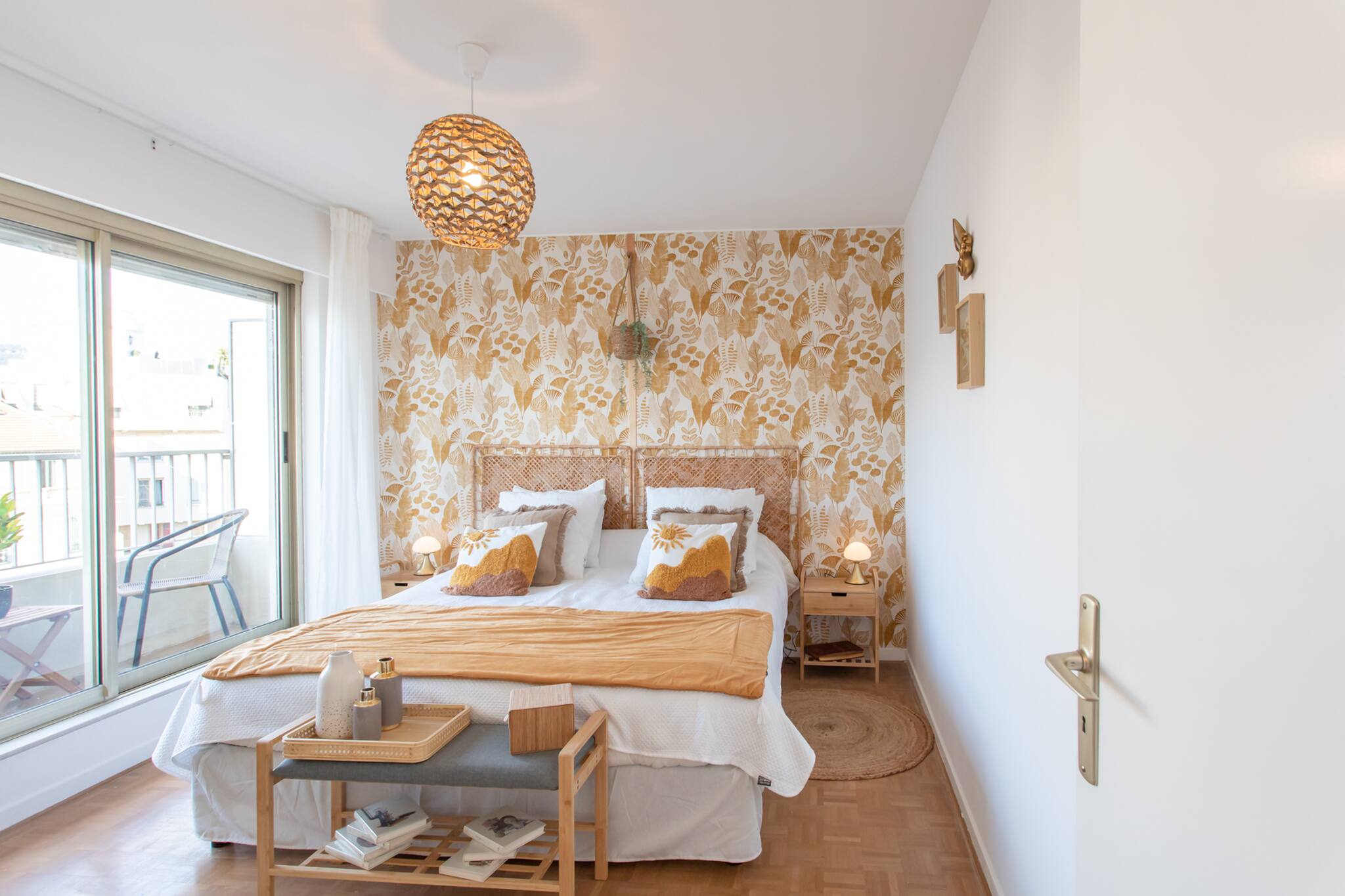 . Une deuxième chambre climatisée avec lit double de 180cm, placards de rangements, rideaux et baie vitrée donnant sur balcon privatif, banc bout de lit
