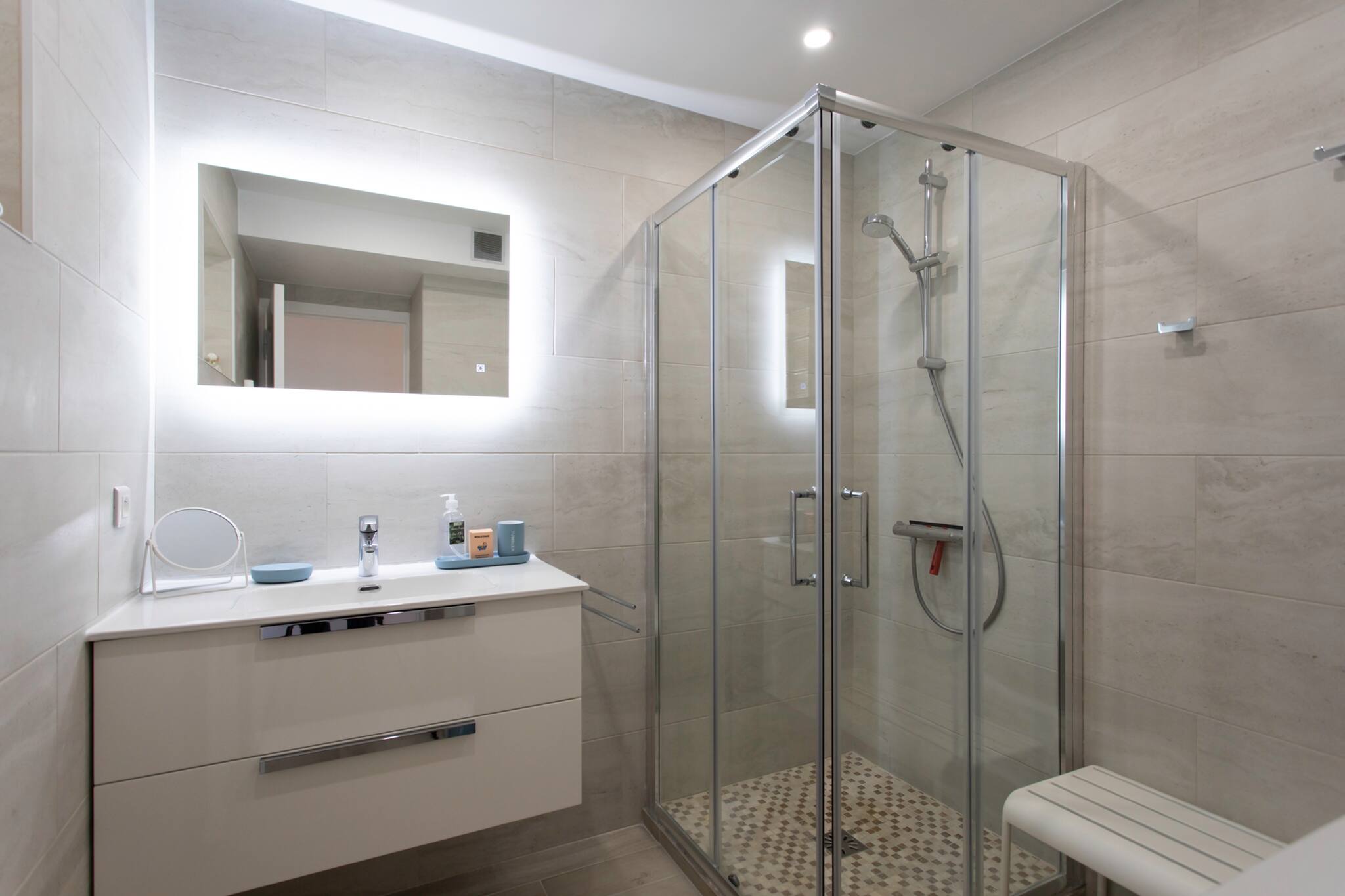 . Une salle de douche équipée d’une cabine de douche, d’une vasque, d’un sèche-cheveux, miroirs et Wc