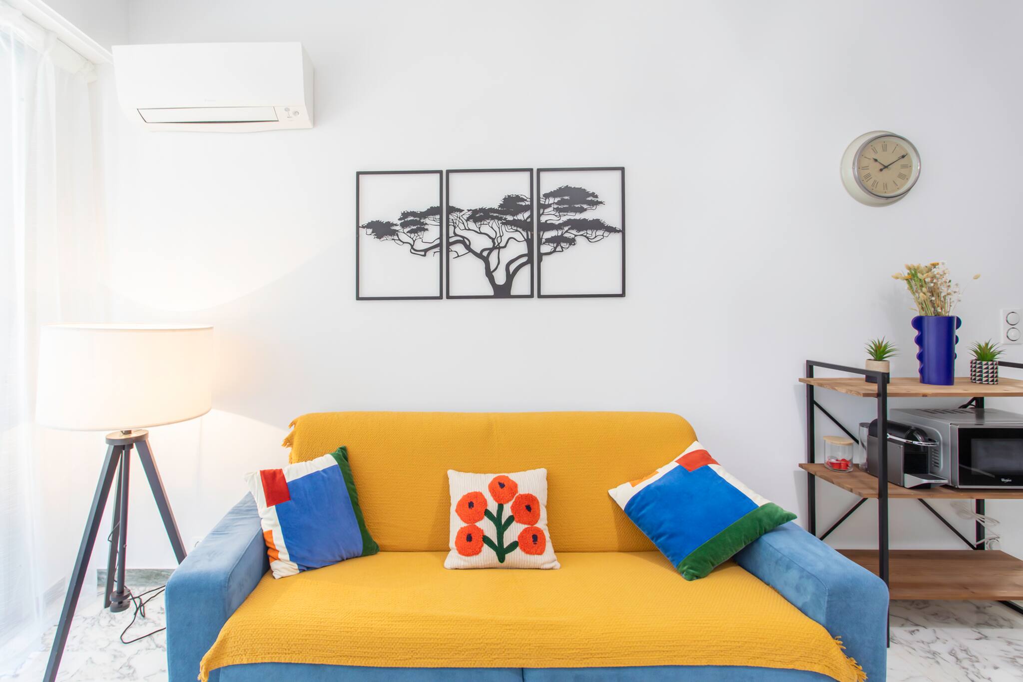 . Un salon avec canapé trois places, TV, une table basse et climatisation réversible
