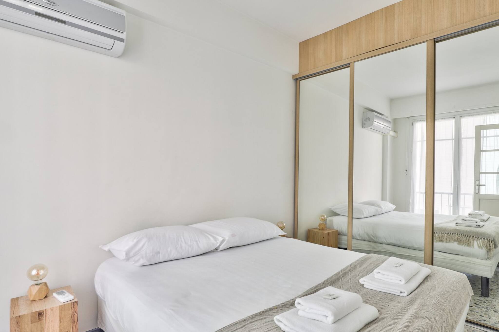 . Une chambre avec lit double 140, table de chevets, lampes de chevets, placards de rangements, double vitrage, miroir de plein pied, accès au balcon vue rue et Mer
