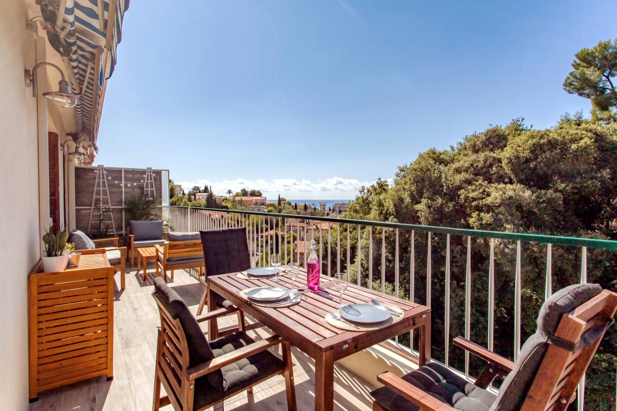 - Une terrasse avec vue ville & mer, espace salon, espace repas et plantes.