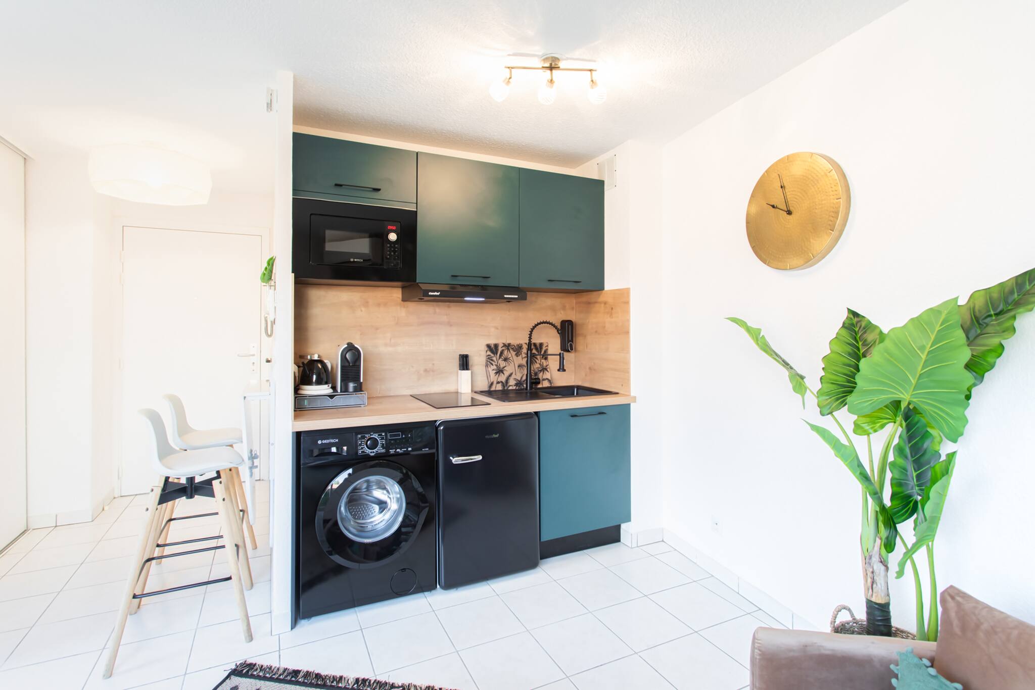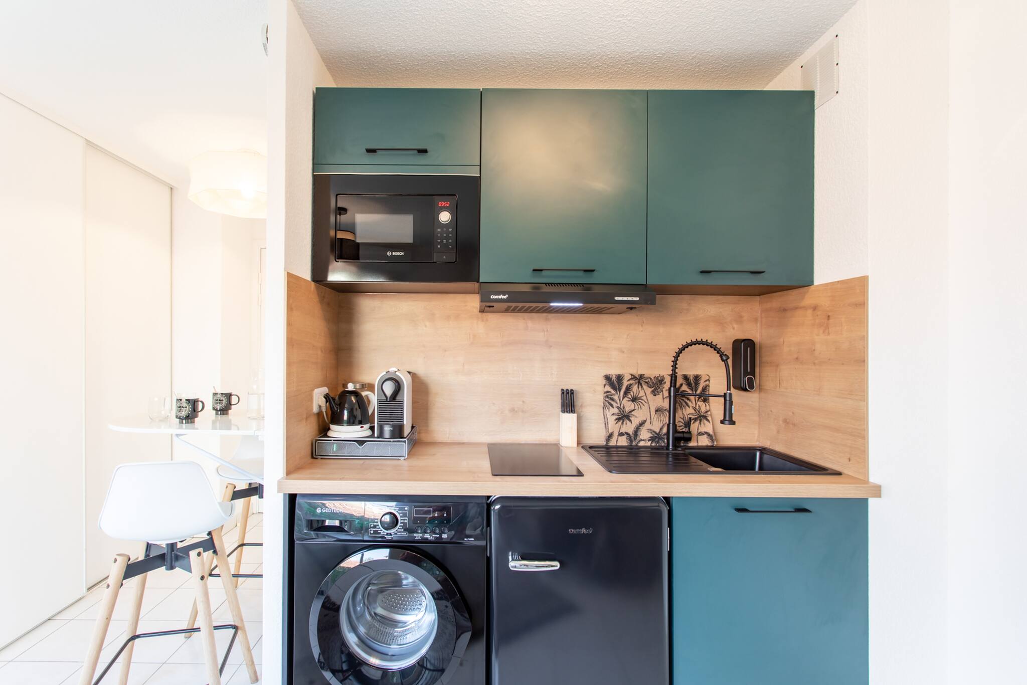 . Une cuisine équipée : réfrigérateur avec espace congélateur, micro-onde, plaque de cuissons avec hotte, machine à laver, machine à café Nespresso, bouilloire, grille-pain et un kit avec le nécessaire pour cuisiner, un espace repas pour deux avec tabourets
