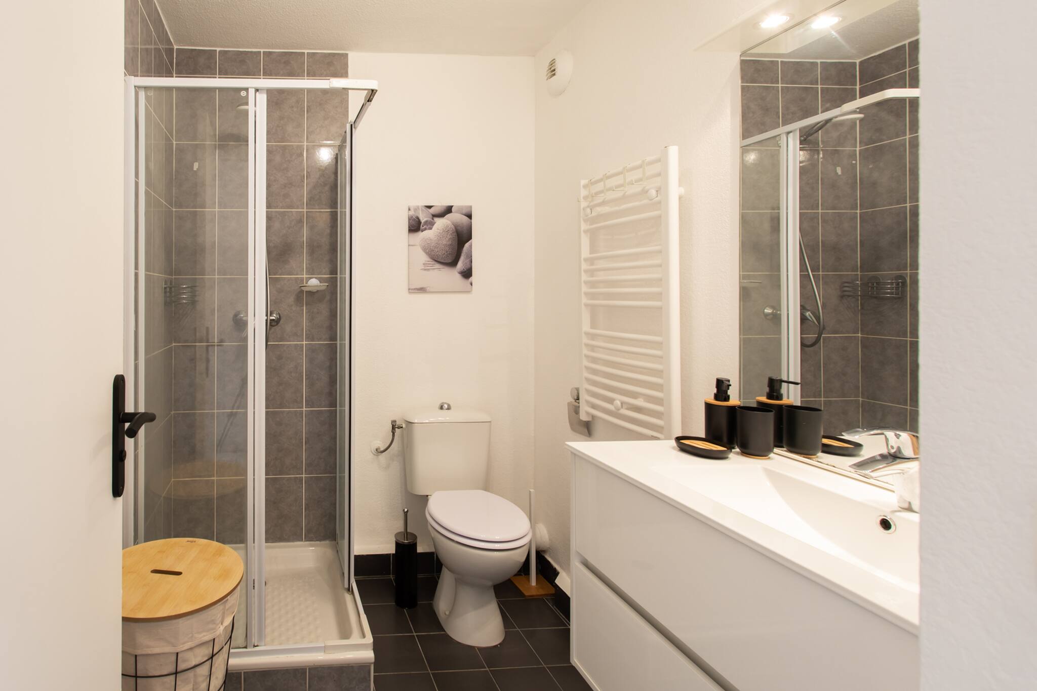 . Une salle de bain équipée d’une douche, d’une vasque avec miroir, sèche-cheveux, WC