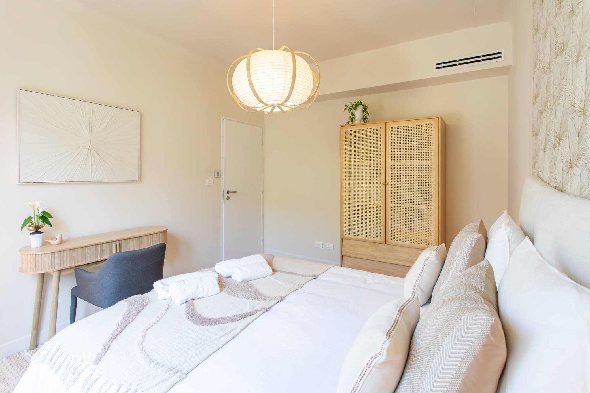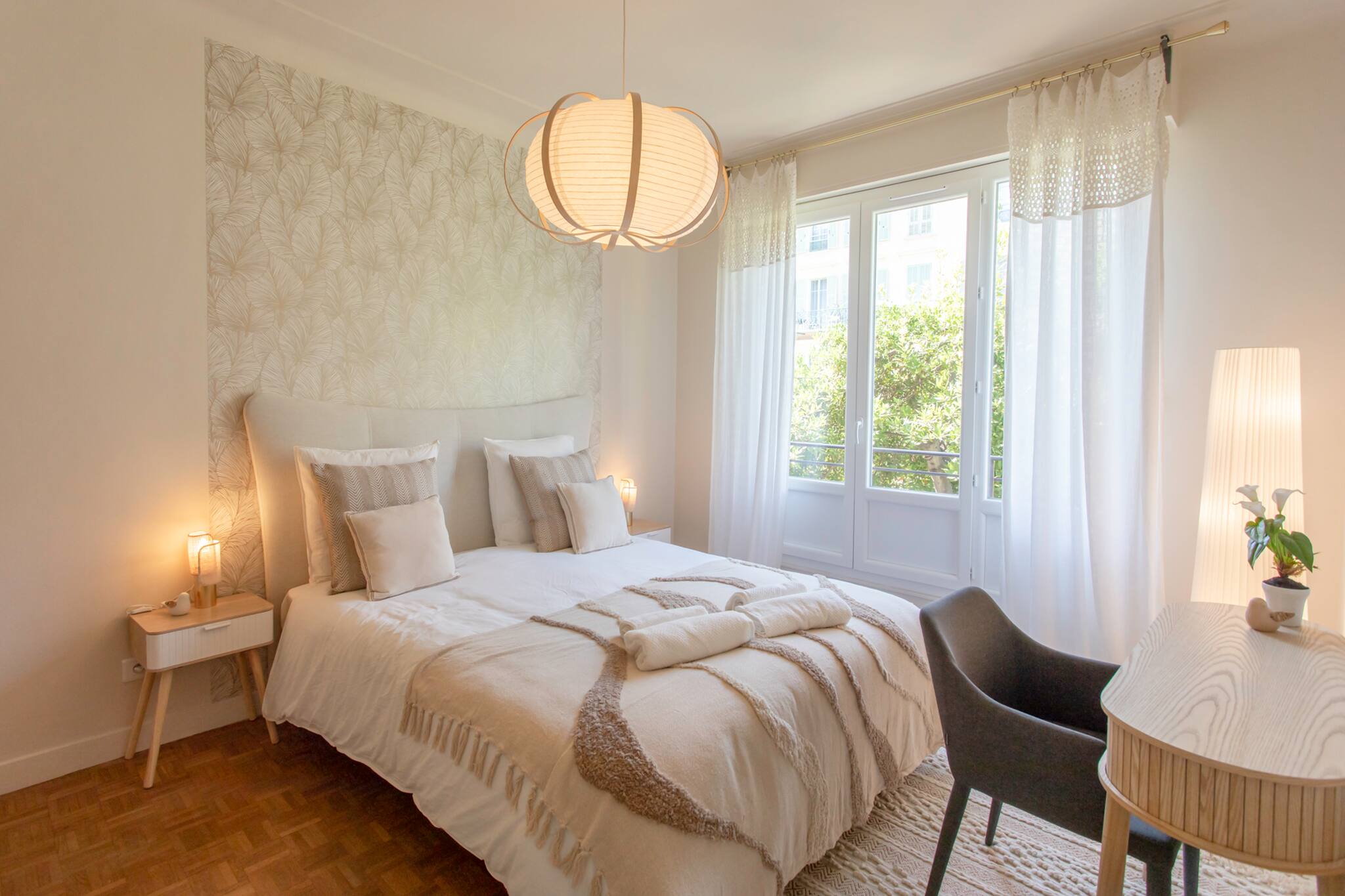 🛏️ Chambre 2 : lit Queen Size (160 cm), deux tables de chevet avec lampes, un bureau avec chaise et espace de rangement.